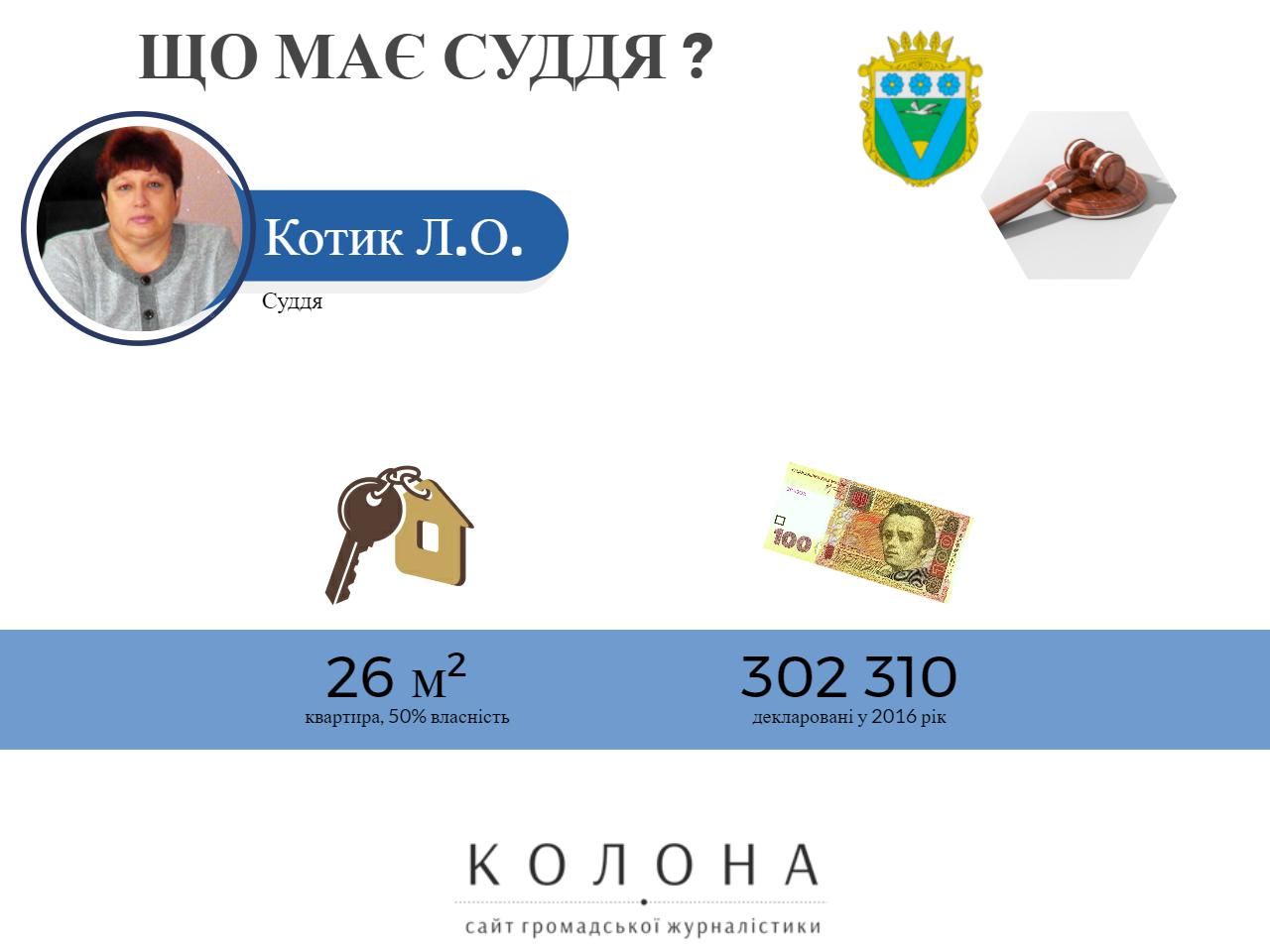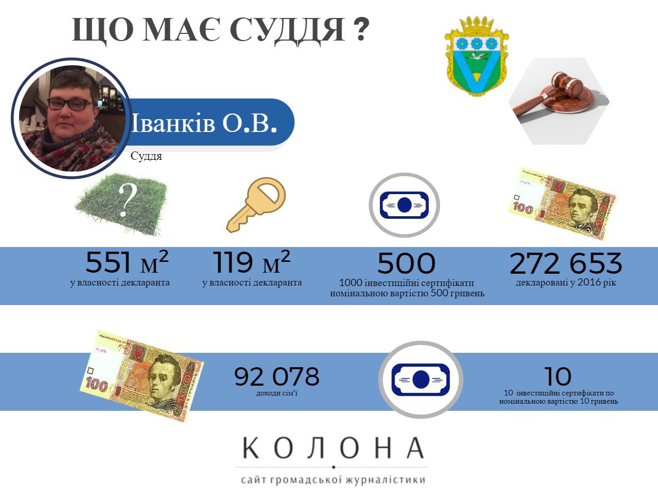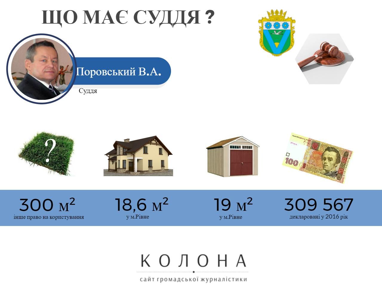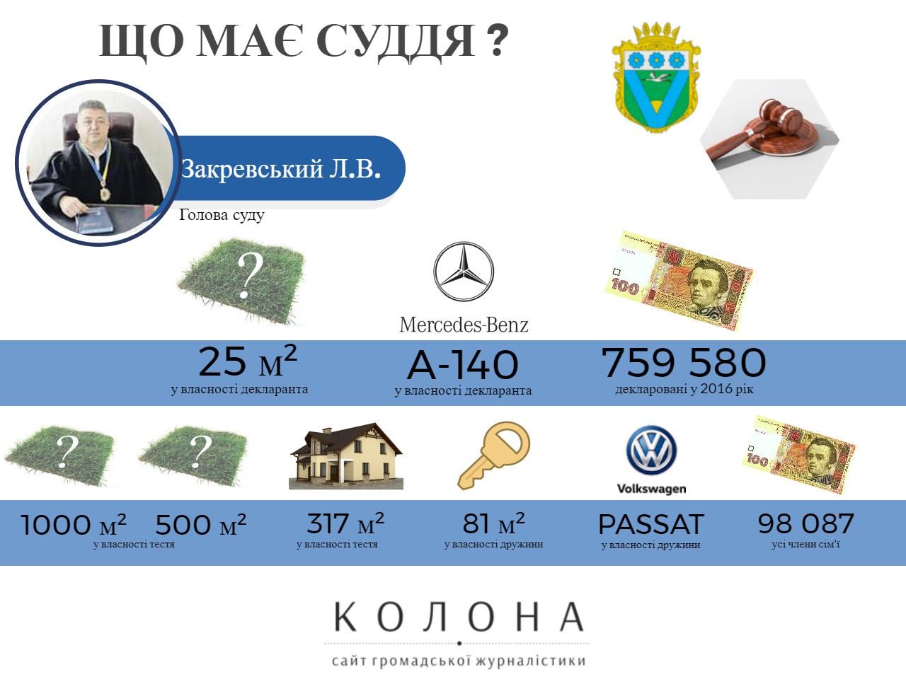 Майже один мільйон доходу за рік, будинок площею більше ніж 100 квадратних метрів та кімнати у гуртожитку, все це декларують судді маленького суду Рівненської області Володимирецького району. Судді по Україні декларують шалені статки, Сайт громадської журналістики вирішив детально проаналізувати доходи та власність судів районних судів. Перший піддослідний це - Володимирецький районний суд. Суд налічує 4 судді, оскільки знаходиться у селищі Володимирець Рівненської області. Новообраний голова Володимирецького суду Закревський Леонід Володимирович Нещодавно суддя був обраний головою Володимирецького суду, детальніше можна почитати у матеріалі - "Обрано нового голову Володимирецького районного суду". Важливо зазначити, що Леонід Володимирович один із найбагатших суддів місцевого суду. Хоч таких у Володимирецькому районному суді - чотири. Нагадаємо, що суддя у своїй власності має лише земельну ділянку, площа якої - 25 метрів квадратних та автомобіль Mercedes марки А-140, 2003 року виробництва. На момент придбання автомобіля у 2015 році суддя заплатив за нього майже 141 тисячу гривень. Щодо доходу то новообраний керівник районного суду задекларував у 2016 році - більше 700 тисяч гривень. Левову частину цих коштів суддя отримав від продажу майна, якого саме не вказано у декларації за 2016 рік. Дружина судді Закревська Оксана Степанівна має у своїй власності автомобіль Volkswagen Passat 2013 року, який на момент придбання у 2016 коштував більше 400 тисяч гривень. Також дружина судді має квартиру у місті Вараш, Рівненської області, площа якої 81 квадратний метр. Тесть судді Каразія Степан Федорович має у власності дві земельних ділянки, площа у сумі яких - 1500 метрів квадратних. Ще тесть судді Леоніда Закревського у 2012 році отримав у власність житловий будинок площею 317 метрів квадратних. Ціна отриманої нерухомості на момент набуття у власність в декларації не вказана. Суддя Котик Людмила Олександрівна Суддя Людмила Котик виконувала обов'язки голови суду до обрання на цю посаду Закревського Леоніда. З усіх суддів Володимирецького райсуду її декларація виглядає дуже скромною. Суддя у своїй власності вказала лише квартиру площа якої - 26 метрів квадратних, а її частка прав на об'єкт складає всього 50%, власником іншої частини є Андрій Сохацький. Дохід Людмили Котик складається лише із заробітної плати, яка у 2016 році склала більше 300 тисяч гривень. Інших членів сім'ї та їх доходів суддя Котик Людмила у декларації не вказала. Суддя Іванків Олена Валеріївна Суддя Олена Іванків у декларації внесла відомості про власність та доходи чоловіка,сина, двох дочок та свої матері. Суддя задекларувала більше 272 тисяч гривень доходу. Ще суддя має велику квартиру, площа якої складає -119 метрів квадратних. На момент придбання у 2006 році, суддя у декларації вказала ціну на квартиру 49 тисяч 963 гривні. Земельна ділянка у власності декларанта також є, її площа становить 551 метр квадратний. Суддя має 1000 інвестиційних сертифікатів у ЗАТ "Інвестиційна компанія "Тект", номінальна вартість яких складає 500 гривень. У власність ці сертифікати суддя отримала їх у 1996 році. Мати судді Чонкіна Ірина Іванівна має 10 інвестиційних сертифікатів у АТЗТ Закритий інвестиційний фонд "Київська Русь МДС", номінальною вартістю 10 гривень. Дохід всіх членів сім'ї складає 92 тисяч гривень, це крім доходу судді про я