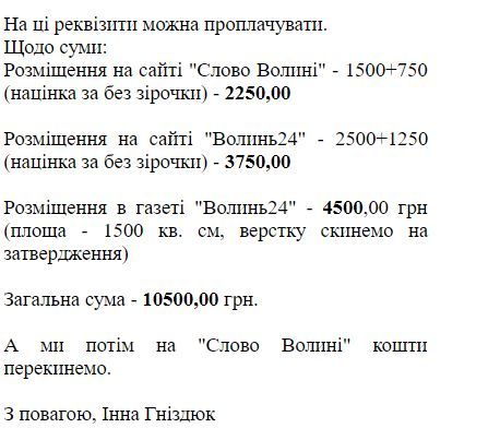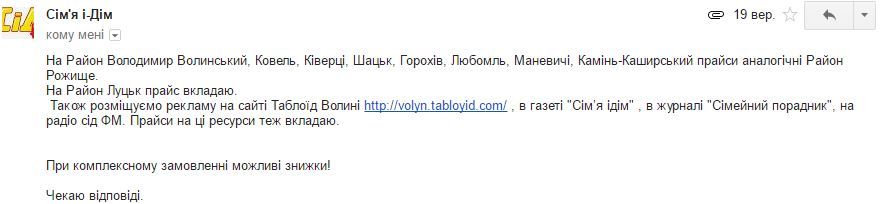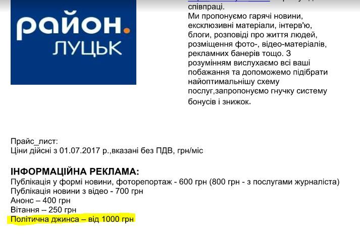 Сайт громадської журналістики вирішив перевірити, які Волинські ЗМІ готові ставити «джинсу», та у скільки оцінють публікацю замовних політичних матеріалів. Чимала кількість ЗМІ погодилася опублікувати замовний матеріал без рекламної позначки, а у мережі сайтів Район.ін у рекламному прайсі навіть вказаний такий вид реклами як - політична джинса. Джинса́ — сленгове слово, яке використовується переважно в медійній спільноті. Синонім терміну «прихована реклама». Означає зумисну приховану рекламу чи антирекламу, подану у вигляді новин, авторських текстів, аналітики й телевізійних програм тощо. Джинса поділяється на комерційну та політичну. У першому випадку рекламують товари чи послуги певної компанії, в другому — політичних діячів. Громадянський журналіст сайту Колона обрав політичну статтю на сайті однієї з політичних партій. Стаття представлена у вигляді інтерв'ю у якому лідер партії коротко розповідає про партію, про її позиції у різних питаннях, про проблеми в Україні та методи якими на його думку можна їх вирішити. Після чого журналіст зконтактував з Волинськими друкованими виданнями та інтернет ресурсами, запропонувавши розмістити політичний матеріал без позначки реклама. Згідно закону про рекламу розділі другого статті 9 «Ідентифікація реклами», прихована реклама забороняється. Також згідно цієї ж статті рекламні матеріали повинні бути позначені рубрикою «Реклама» чи «На правах реклами». У даній статті зазначено, що частина ЗМІ погодилися на публікацію «джинси», про це свідчать рахунки відправлені для оплати, готовність укласти договір, а також домовленості під час спілкування по телефону, або ж електронною поштою. Слід зазначити, що жодна з домовленостей так і не відбулася, договори не було укладено, так як редакція сайту громадської журналістики, не готова фінансувати інші ЗМІ оплачуючи публікації прихованої реклами. Агенції медіа-технологій «СІД ІНФОРМ» Агенції медіа-технологій «СІД ІНФОРМ» входить до медіа холдингу «CID MEDIA GROUP» та охоплює низку видань, серед яких мережа сайтів «rayon.in.ua» до яких входять сайти Район.Луцьк, Район.Ковель, Район.Камінь-Каширський,Район.Любомль, Район.Шацьк, Район.Горохів, Район.Ківерці і Район.Острог, сайт «Таблоїд Волині», газета «Сім'я і дім», журнал «Сімейний порадник» та радіо «Сід ФМ». Зв'язавшись з представником, який відповідає за рекламу на одному з цих ресурсів, нам запропонували список видань перелічених вище, як варіанти де ще можна опублікувати статтю, та надали прайси на рекламу. Після чого ми обрали ресурси на яких публікаціях даних матеріалів була б доречною, це мережа сайтів «rayon.in.ua» по Волинській області та газета «Сім'я і дім» у які ми запропонували розмістити політичну статтю, а на сайт «Волинь таблоїд» спробували домовитися про інтерв'ю з нібито майбутнім керівником партійного осередку. Дізнавшись, що розмістити потрібно політичний матеріал, відразу ж уточнили, що не від усіх політичних партій приймаються матеріали для публікації, а на питання чи є можливість опублікувати політичний матеріалу без позначки «реклама», нам повідомили про те, що не можуть опублікувати матеріал без відповідної мітки. Проте після того, як наш громадянський журналіст повідомив, що замовлення не відбудеться, якщо буде стояти позначка, у агенстві передумали, і погодилися . Публі