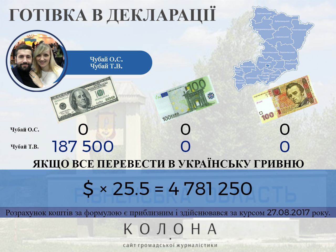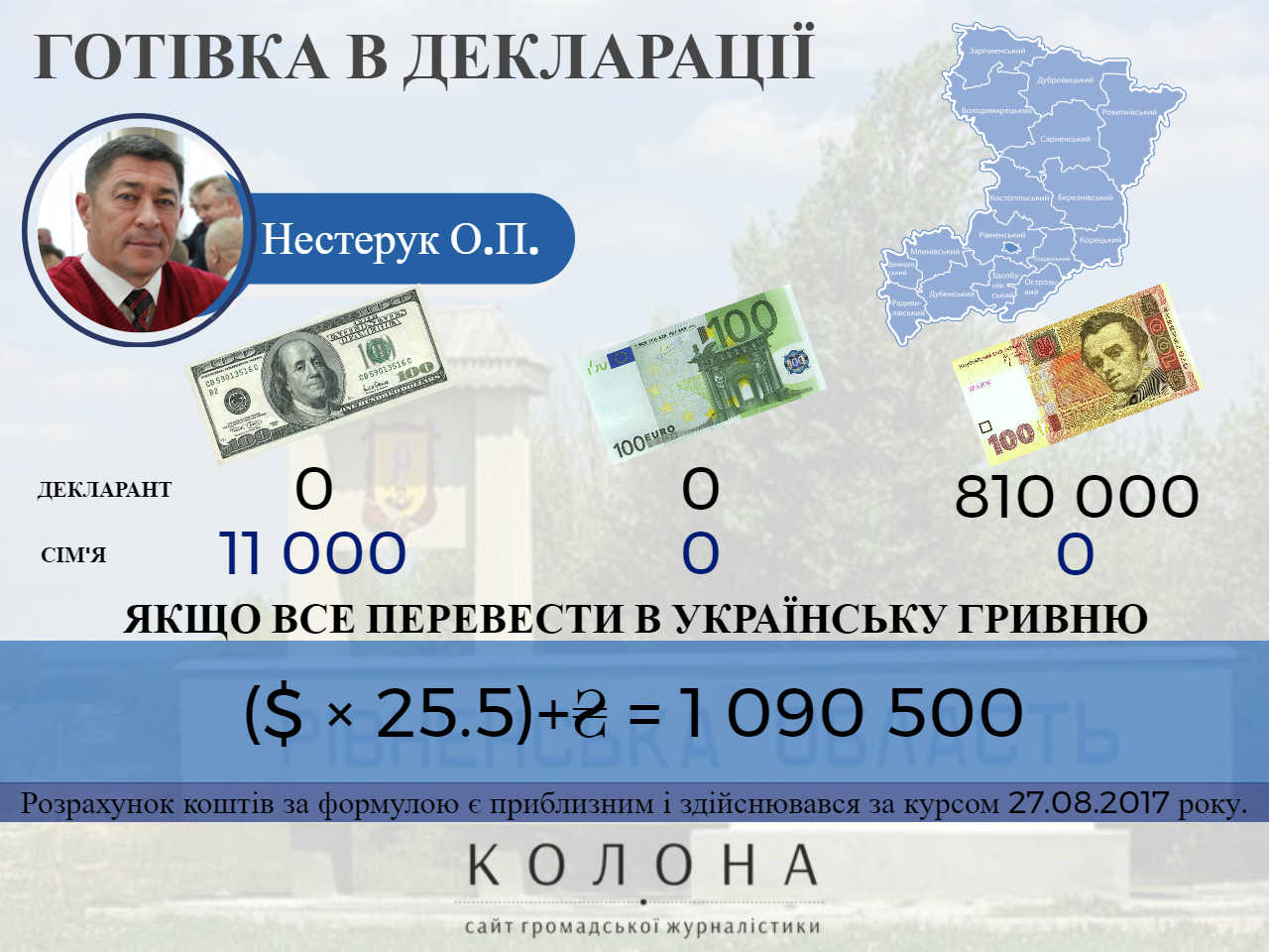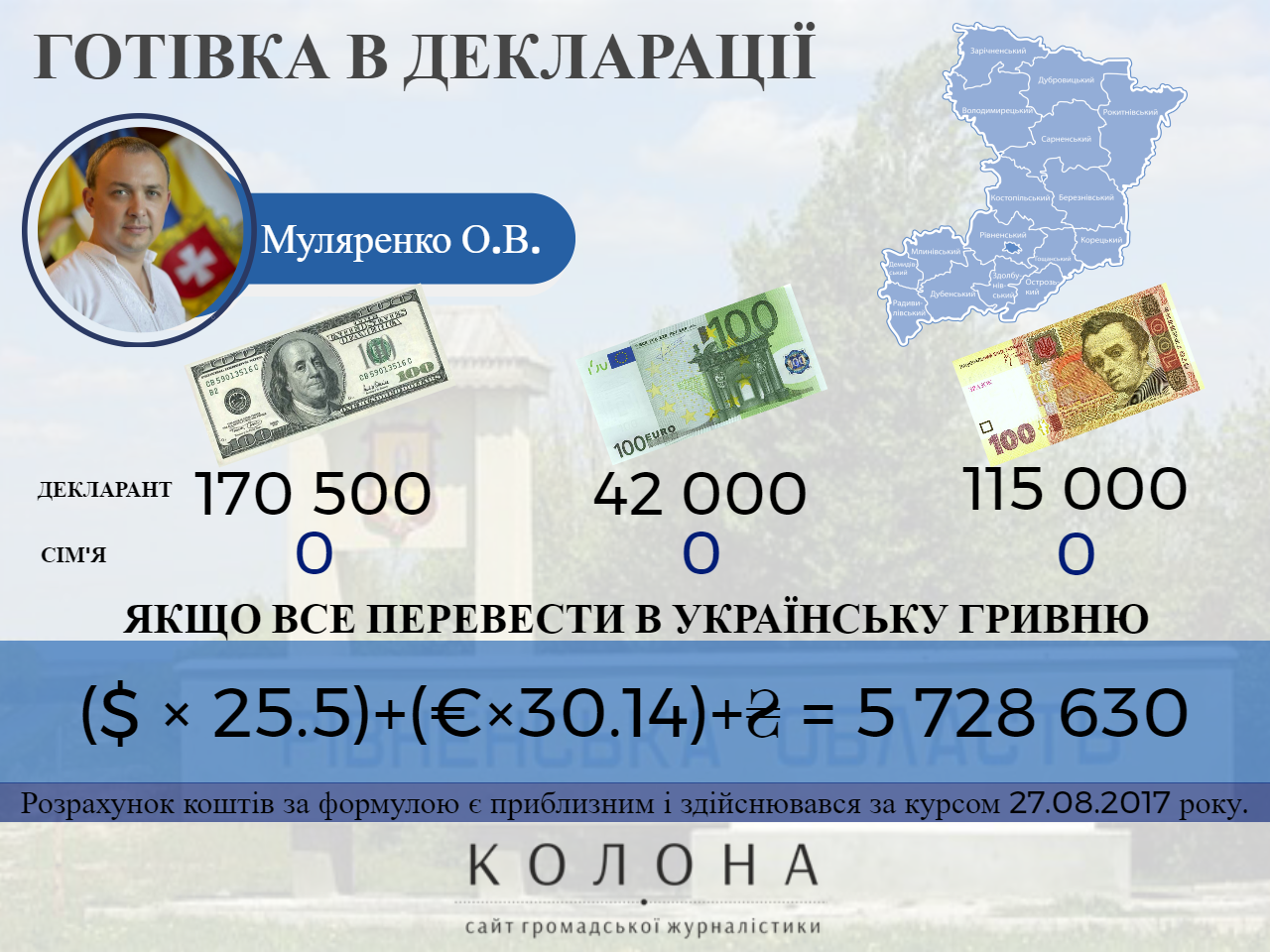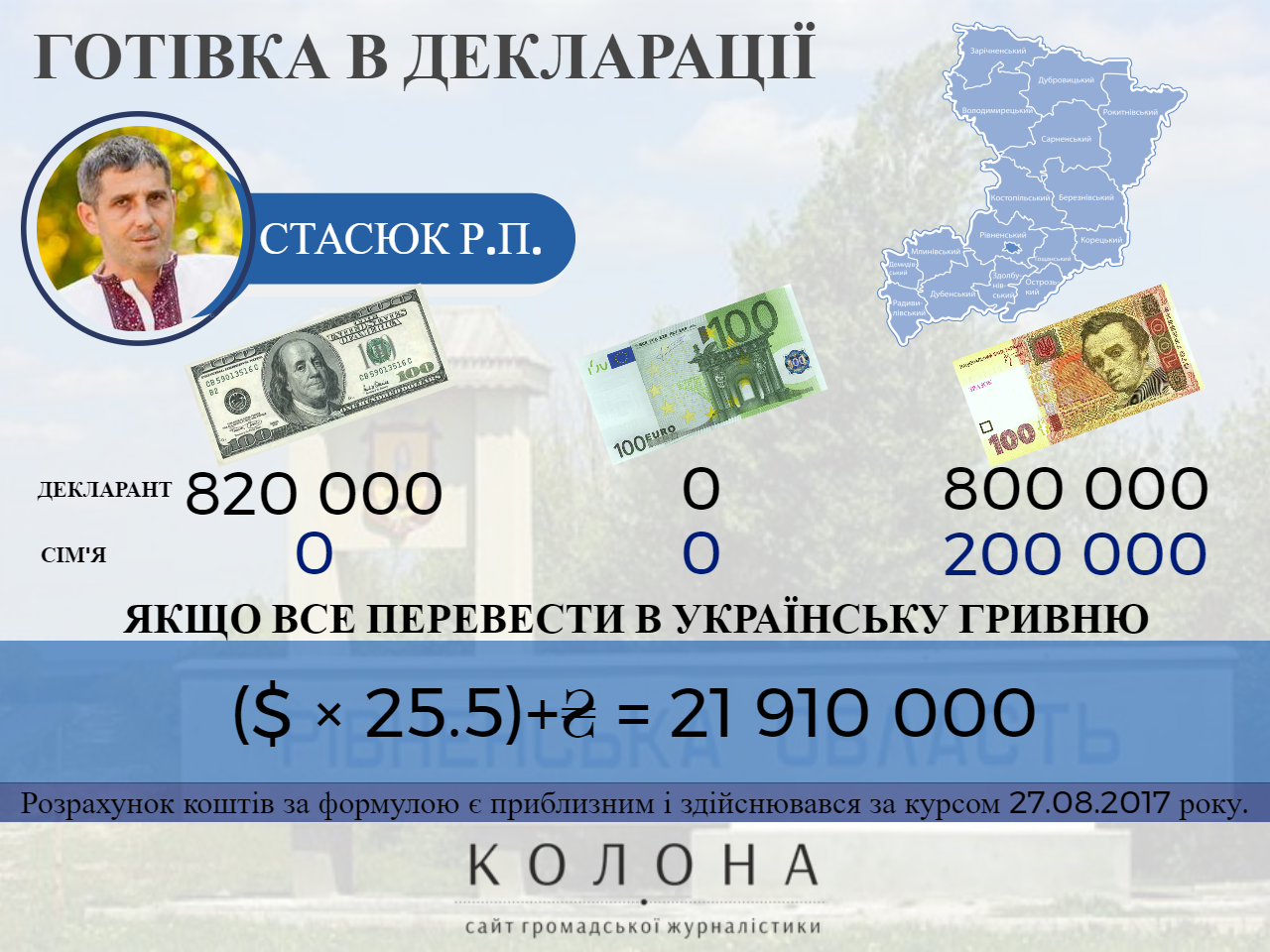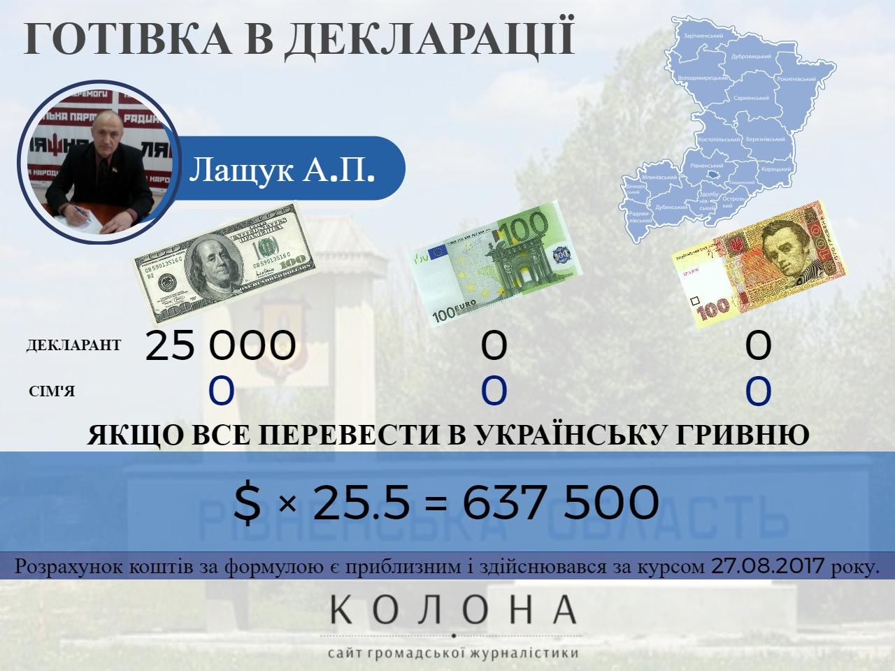 Найблільше готівки серед депутатів Рівнеради зберігає радикал Роман Стасюк. У декларації Ірини Пилипчук не вказано скільки готівки мають члени сімї, також не вказано у якій валюті ці кошти зберігаються. Анатолій Лащук немає власної готівки про те він позичив третім особам 25 тисяч доларів. З 42 депутатів Рівненської міської ради, 9 депутатів взагалі не вказали готівки у своїх деклараціях за 2016 рік. В основному депутати та члени їхніх сімей зберігають готівкові кошти в доларах, з 42 декларацій, у 23 вказано готівку в доларах, в 15 деклараціях зазначено збереження у національній валюті, і у 6 деклараціях вказано готівку у євровалюті. Примітка: до готівкових котів також враховано кошти позичені третім собам та внески до кредиторних спілок та інших небанківських фінансових установ. Набагатшим депутатом Рівненської міської ради є Роман Стасюк, депутат фракції "Радикальна партія Олега Ляшка" . У його декларації за 2016 рік вказано 820 тисяч доларів, 800 тисяч гривень власником яких є сам декларант, дружина депутата Стасюк Орислава є власницею 200 тисяч гривень. Роман Стасюк досі не прозвітувався перед своїми виборцями, хоча згідно розпорядження міської ради це портрібно було зробити ще у лютому 2017. Детальніше про те як звітувалися депутатиміськради читайте у публікації: Чи подають звіти депутати Рівненської міської ради? [Інфографіка] Депутат фракції "Самопоміч" Маріан Года задекларував у готівці 324 тисячі доларів. Людмила Чирак та Маріан Года є одними з найбільших автовласників у Рівненській міській раді. Ще один депутат "Самопомочі" - Чирак Людмила замикає трійку найбагатших депутатів Рівненської міськради. Людмила Чирак є власницею 39 500 доларів, її чоловік Ігор Чирак є власником 65 тисяч доларів, також згідно декларації він позичив третім особам 155 тисяч доларів. Голова Рівненської обласної державної адміністрації, та депутат міськради який перебуває у фракції "Блок Петра Порошенка "Солідарність" Олексій Муляренко задекларував у готівці 115 тисяч гривень, 170 тисяч 500 доларів та 42 тисячі євро. Згідно аналітики громадського руху "Чесно", Муляренко є одним з трьох депутатів, який за результатами відвідуваності сесій та комісій міськради за 2016 рік, може втратити свій мандат. Читайте детальніше про ще двох претендентів Рівненської міськради на позбавлення мандату. Також читайте повну версію про усіх прогульників Рівненської міської ради. Чубай Тетяна від фракції "Громадський контроль" зберігає у готівці 187 500 доларів, цю ж суму але уже у власності членів сім'ї задекларував її чоловік Чубай Олександр від фракції "БПП". Тимощук Тамара від фракції "Блоку Петра Порошенка "Солідарність" у готівці зберігає 500 000 тисяч гривень, 80 тисяч доларів, та 30 тисяч євро. Секретар міської ради та депутат фракції "БПП" Сергій Паладійчук вказав у декларації 68 тисяч 400 доларів, 8500 євро. Також Паладійчук вказав у декларації кошти позичені третім особам 24 600 доларів, та 735 тисяч гривень. також у Сергія Паладійчука є внески до кредиторних спілок та інших небнківських фінансових установ у розмірі 62 тисячі 400 гривень. Перший номер у списку від "Самопомочі" на виборах 2015 року Ігор Ковалець зберігає у готівці 15 тисяч доларів. Про те позичив третім особам 78 тисяч 500 доларів. Перший номер ВО "Свободи" на минулих виборах у Рівному Юрій Осіпчук зберігає у готівці 2 200 000 гривень. Гапяк Б