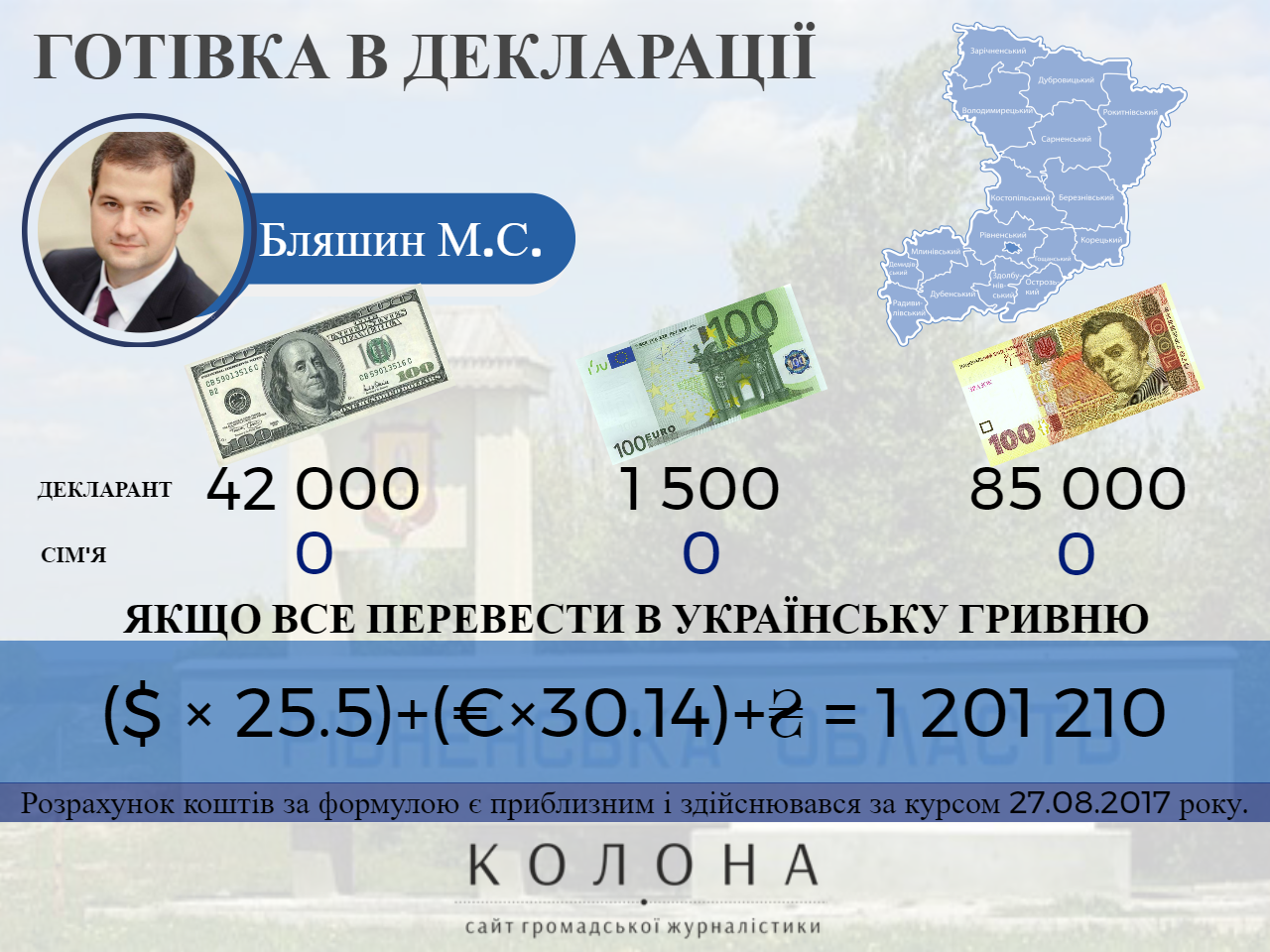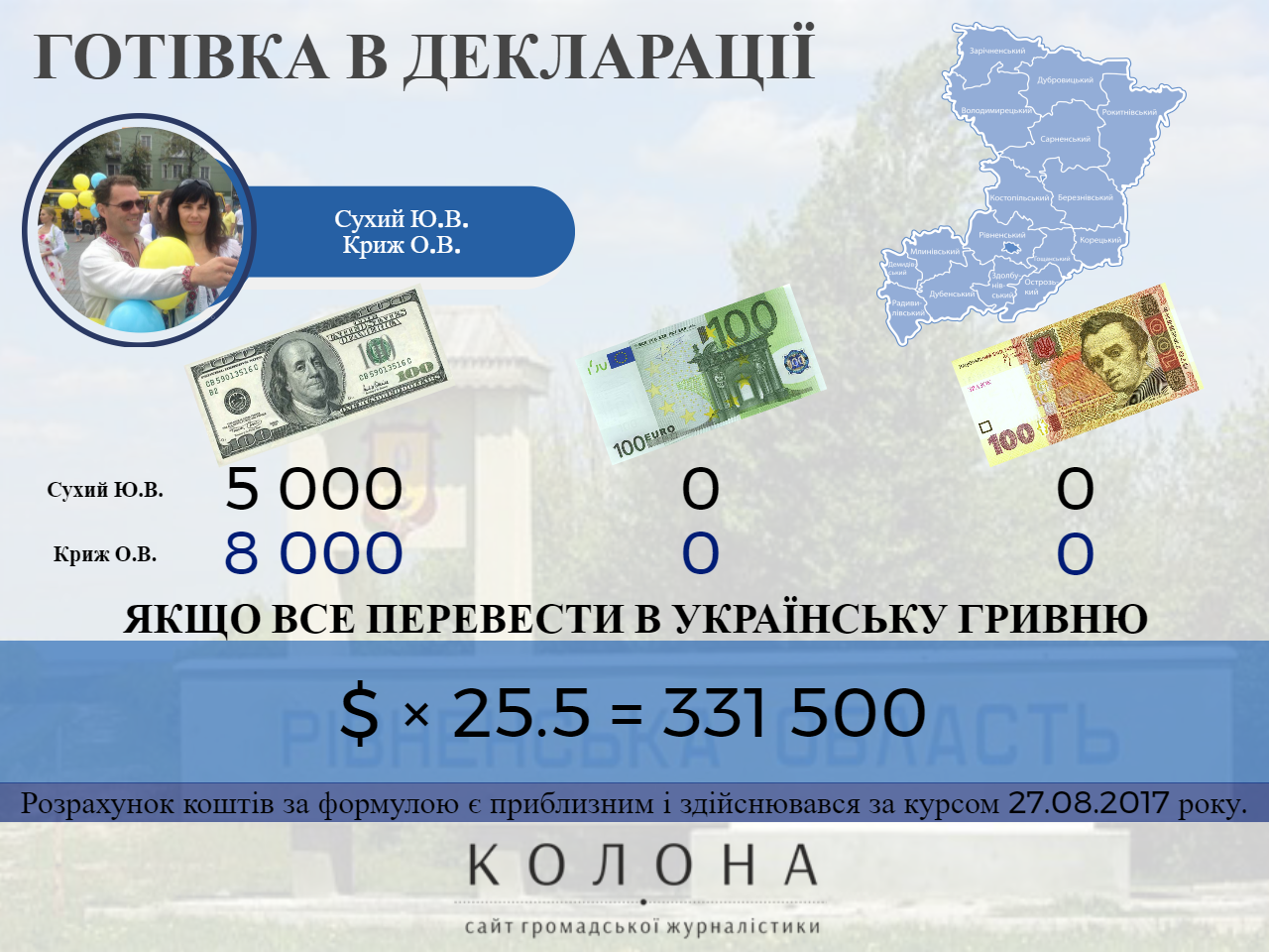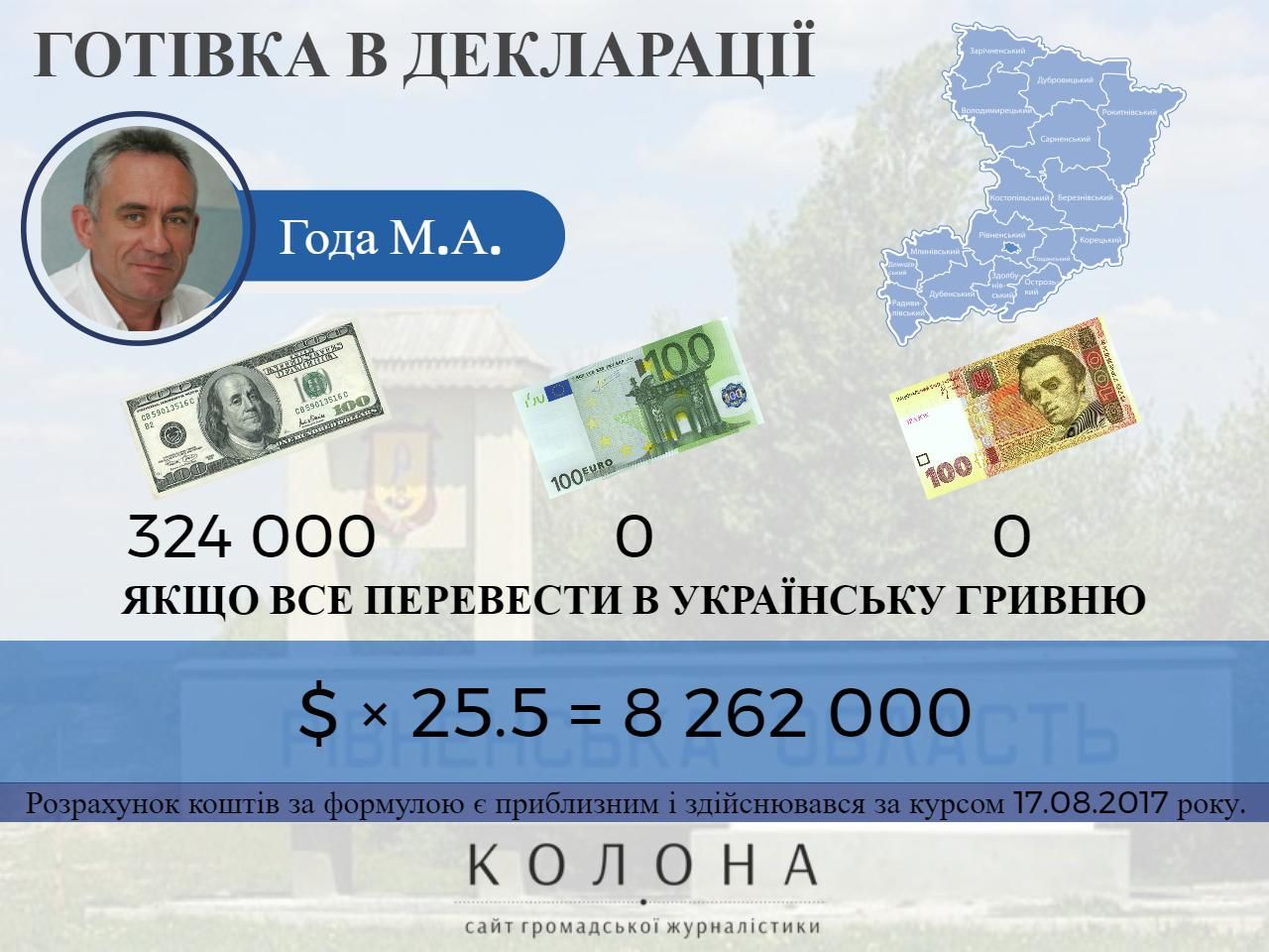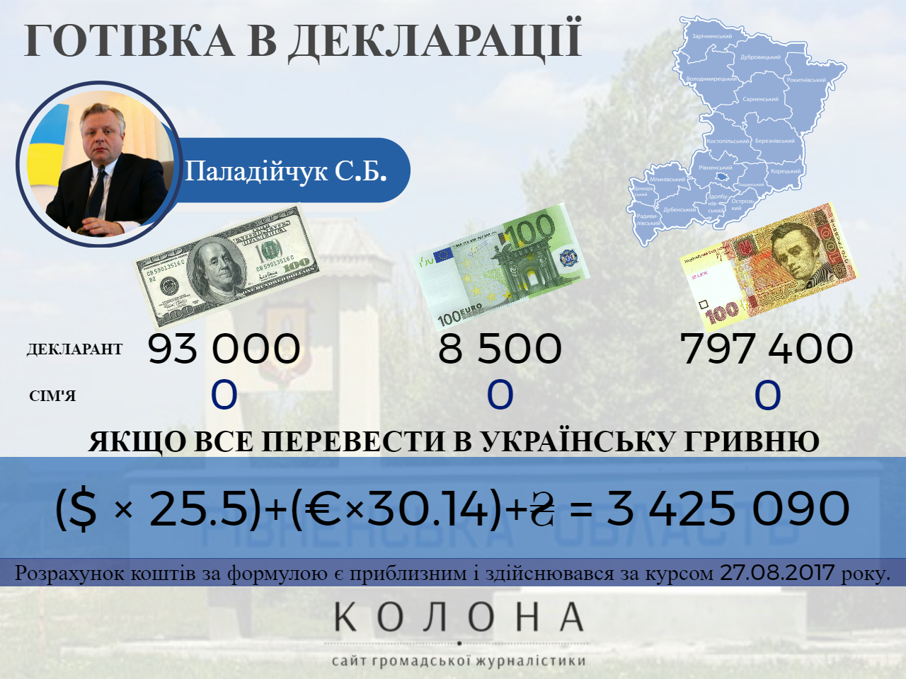 Найблільше готівки серед депутатів Рівнеради зберігає радикал Роман Стасюк. У декларації Ірини Пилипчук не вказано скільки готівки мають члени сімї, також не вказано у якій валюті ці кошти зберігаються. Анатолій Лащук немає власної готівки про те він позичив третім особам 25 тисяч доларів. З 42 депутатів Рівненської міської ради, 9 депутатів взагалі не вказали готівки у своїх деклараціях за 2016 рік. В основному депутати та члени їхніх сімей зберігають готівкові кошти в доларах, з 42 декларацій, у 23 вказано готівку в доларах, в 15 деклараціях зазначено збереження у національній валюті, і у 6 деклараціях вказано готівку у євровалюті. Примітка: до готівкових котів також враховано кошти позичені третім собам та внески до кредиторних спілок та інших небанківських фінансових установ. Набагатшим депутатом Рівненської міської ради є Роман Стасюк, депутат фракції "Радикальна партія Олега Ляшка" . У його декларації за 2016 рік вказано 820 тисяч доларів, 800 тисяч гривень власником яких є сам декларант, дружина депутата Стасюк Орислава є власницею 200 тисяч гривень. Роман Стасюк досі не прозвітувався перед своїми виборцями, хоча згідно розпорядження міської ради це портрібно було зробити ще у лютому 2017. Детальніше про те як звітувалися депутатиміськради читайте у публікації: Чи подають звіти депутати Рівненської міської ради? [Інфографіка] Депутат фракції "Самопоміч" Маріан Года задекларував у готівці 324 тисячі доларів. Людмила Чирак та Маріан Года є одними з найбільших автовласників у Рівненській міській раді. Ще один депутат "Самопомочі" - Чирак Людмила замикає трійку найбагатших депутатів Рівненської міськради. Людмила Чирак є власницею 39 500 доларів, її чоловік Ігор Чирак є власником 65 тисяч доларів, також згідно декларації він позичив третім особам 155 тисяч доларів. Голова Рівненської обласної державної адміністрації, та депутат міськради який перебуває у фракції "Блок Петра Порошенка "Солідарність" Олексій Муляренко задекларував у готівці 115 тисяч гривень, 170 тисяч 500 доларів та 42 тисячі євро. Згідно аналітики громадського руху "Чесно", Муляренко є одним з трьох депутатів, який за результатами відвідуваності сесій та комісій міськради за 2016 рік, може втратити свій мандат. Читайте детальніше про ще двох претендентів Рівненської міськради на позбавлення мандату. Також читайте повну версію про усіх прогульників Рівненської міської ради. Чубай Тетяна від фракції "Громадський контроль" зберігає у готівці 187 500 доларів, цю ж суму але уже у власності членів сім'ї задекларував її чоловік Чубай Олександр від фракції "БПП". Тимощук Тамара від фракції "Блоку Петра Порошенка "Солідарність" у готівці зберігає 500 000 тисяч гривень, 80 тисяч доларів, та 30 тисяч євро. Секретар міської ради та депутат фракції "БПП" Сергій Паладійчук вказав у декларації 68 тисяч 400 доларів, 8500 євро. Також Паладійчук вказав у декларації кошти позичені третім особам 24 600 доларів, та 735 тисяч гривень. також у Сергія Паладійчука є внески до кредиторних спілок та інших небнківських фінансових установ у розмірі 62 тисячі 400 гривень. Перший номер у списку від "Самопомочі" на виборах 2015 року Ігор Ковалець зберігає у готівці 15 тисяч доларів. Про те позичив третім особам 78 тисяч 500 доларів. Перший номер ВО "Свободи" на минулих виборах у Рівному Юрій Осіпчук зберігає у готівці 2 200 000 гривень. Гапяк Б