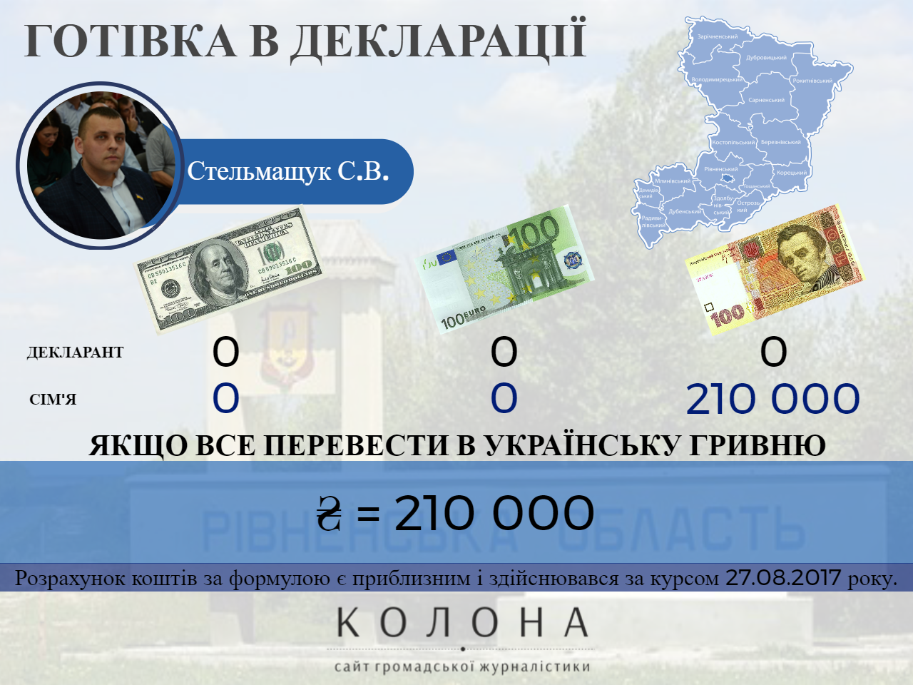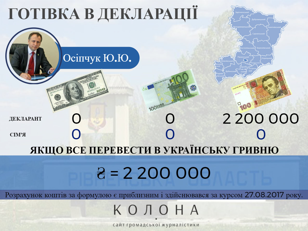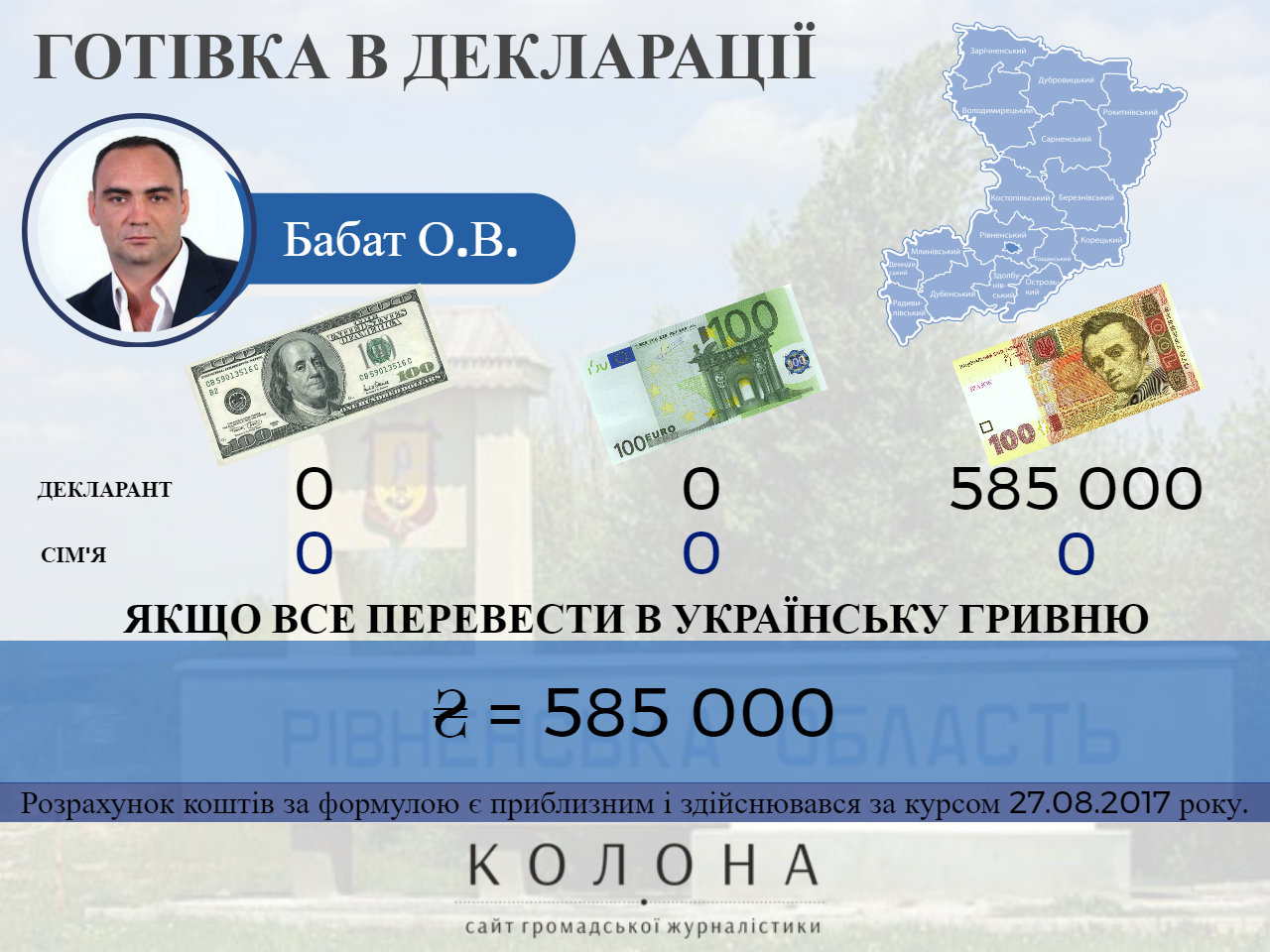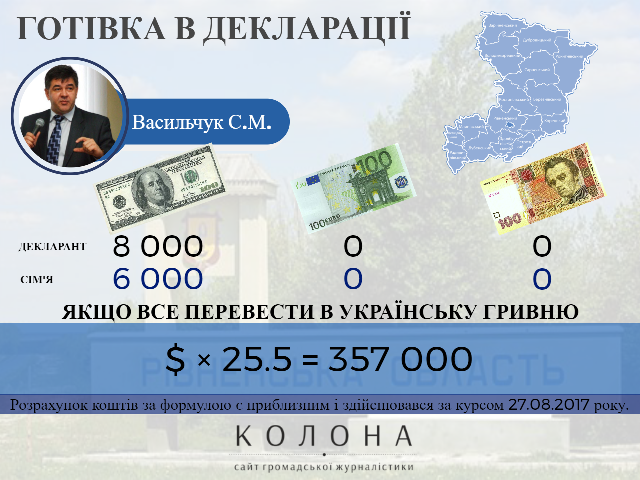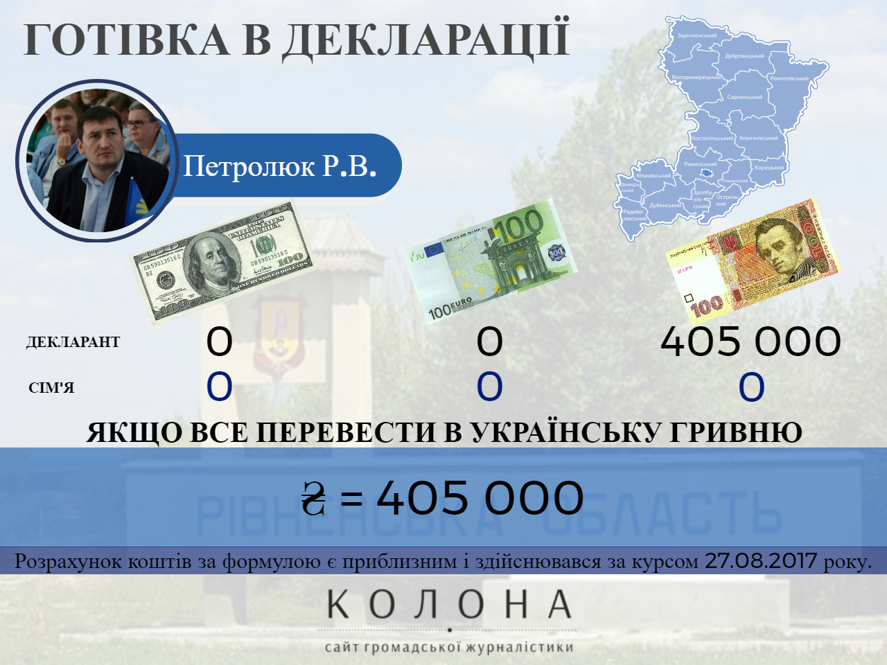 Найблільше готівки серед депутатів Рівнеради зберігає радикал Роман Стасюк. У декларації Ірини Пилипчук не вказано скільки готівки мають члени сімї, також не вказано у якій валюті ці кошти зберігаються. Анатолій Лащук немає власної готівки про те він позичив третім особам 25 тисяч доларів. З 42 депутатів Рівненської міської ради, 9 депутатів взагалі не вказали готівки у своїх деклараціях за 2016 рік. В основному депутати та члени їхніх сімей зберігають готівкові кошти в доларах, з 42 декларацій, у 23 вказано готівку в доларах, в 15 деклараціях зазначено збереження у національній валюті, і у 6 деклараціях вказано готівку у євровалюті. Примітка: до готівкових котів також враховано кошти позичені третім собам та внески до кредиторних спілок та інших небанківських фінансових установ. Набагатшим депутатом Рівненської міської ради є Роман Стасюк, депутат фракції "Радикальна партія Олега Ляшка" . У його декларації за 2016 рік вказано 820 тисяч доларів, 800 тисяч гривень власником яких є сам декларант, дружина депутата Стасюк Орислава є власницею 200 тисяч гривень. Роман Стасюк досі не прозвітувався перед своїми виборцями, хоча згідно розпорядження міської ради це портрібно було зробити ще у лютому 2017. Детальніше про те як звітувалися депутатиміськради читайте у публікації: Чи подають звіти депутати Рівненської міської ради? [Інфографіка] Депутат фракції "Самопоміч" Маріан Года задекларував у готівці 324 тисячі доларів. Людмила Чирак та Маріан Года є одними з найбільших автовласників у Рівненській міській раді. Ще один депутат "Самопомочі" - Чирак Людмила замикає трійку найбагатших депутатів Рівненської міськради. Людмила Чирак є власницею 39 500 доларів, її чоловік Ігор Чирак є власником 65 тисяч доларів, також згідно декларації він позичив третім особам 155 тисяч доларів. Голова Рівненської обласної державної адміністрації, та депутат міськради який перебуває у фракції "Блок Петра Порошенка "Солідарність" Олексій Муляренко задекларував у готівці 115 тисяч гривень, 170 тисяч 500 доларів та 42 тисячі євро. Згідно аналітики громадського руху "Чесно", Муляренко є одним з трьох депутатів, який за результатами відвідуваності сесій та комісій міськради за 2016 рік, може втратити свій мандат. Читайте детальніше про ще двох претендентів Рівненської міськради на позбавлення мандату. Також читайте повну версію про усіх прогульників Рівненської міської ради. Чубай Тетяна від фракції "Громадський контроль" зберігає у готівці 187 500 доларів, цю ж суму але уже у власності членів сім'ї задекларував її чоловік Чубай Олександр від фракції "БПП". Тимощук Тамара від фракції "Блоку Петра Порошенка "Солідарність" у готівці зберігає 500 000 тисяч гривень, 80 тисяч доларів, та 30 тисяч євро. Секретар міської ради та депутат фракції "БПП" Сергій Паладійчук вказав у декларації 68 тисяч 400 доларів, 8500 євро. Також Паладійчук вказав у декларації кошти позичені третім особам 24 600 доларів, та 735 тисяч гривень. також у Сергія Паладійчука є внески до кредиторних спілок та інших небнківських фінансових установ у розмірі 62 тисячі 400 гривень. Перший номер у списку від "Самопомочі" на виборах 2015 року Ігор Ковалець зберігає у готівці 15 тисяч доларів. Про те позичив третім особам 78 тисяч 500 доларів. Перший номер ВО "Свободи" на минулих виборах у Рівному Юрій Осіпчук зберігає у готівці 2 200 000 гривень. Гапяк Б