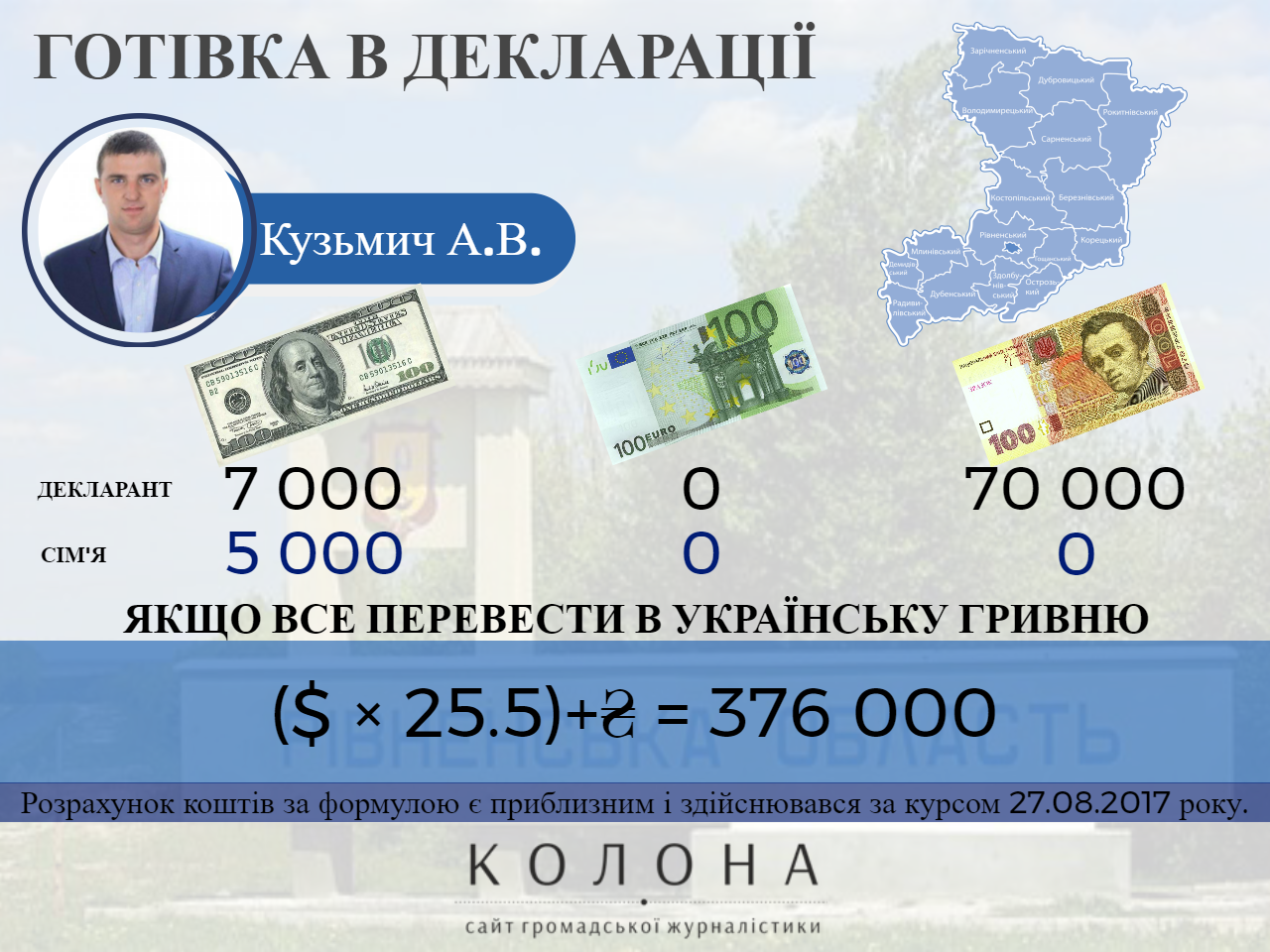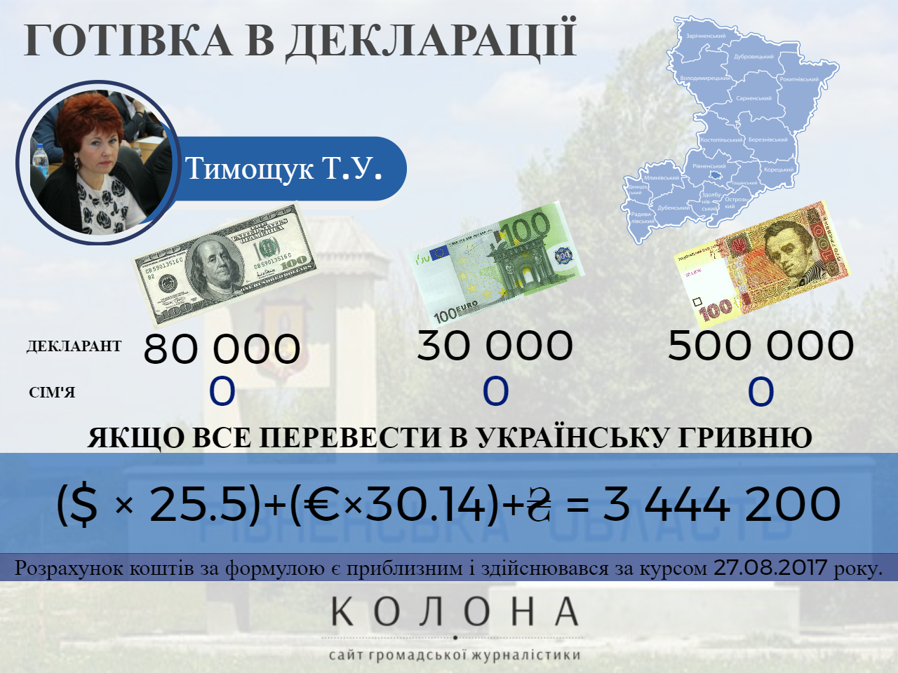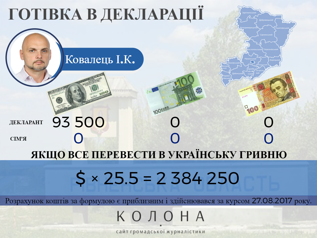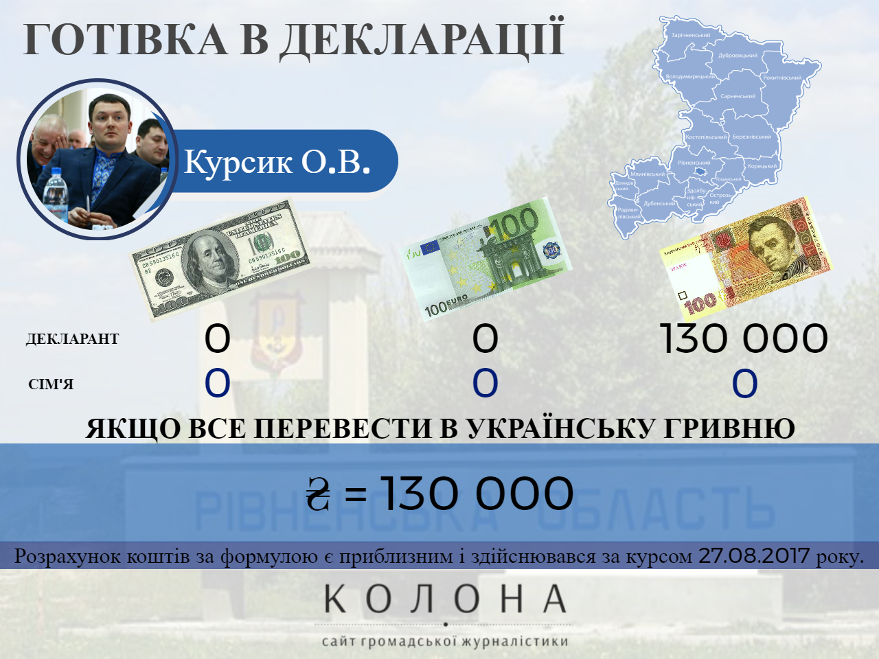 Найблільше готівки серед депутатів Рівнеради зберігає радикал Роман Стасюк. У декларації Ірини Пилипчук не вказано скільки готівки мають члени сімї, також не вказано у якій валюті ці кошти зберігаються. Анатолій Лащук немає власної готівки про те він позичив третім особам 25 тисяч доларів. З 42 депутатів Рівненської міської ради, 9 депутатів взагалі не вказали готівки у своїх деклараціях за 2016 рік. В основному депутати та члени їхніх сімей зберігають готівкові кошти в доларах, з 42 декларацій, у 23 вказано готівку в доларах, в 15 деклараціях зазначено збереження у національній валюті, і у 6 деклараціях вказано готівку у євровалюті. Примітка: до готівкових котів також враховано кошти позичені третім собам та внески до кредиторних спілок та інших небанківських фінансових установ. Набагатшим депутатом Рівненської міської ради є Роман Стасюк, депутат фракції "Радикальна партія Олега Ляшка" . У його декларації за 2016 рік вказано 820 тисяч доларів, 800 тисяч гривень власником яких є сам декларант, дружина депутата Стасюк Орислава є власницею 200 тисяч гривень. Роман Стасюк досі не прозвітувався перед своїми виборцями, хоча згідно розпорядження міської ради це портрібно було зробити ще у лютому 2017. Детальніше про те як звітувалися депутатиміськради читайте у публікації: Чи подають звіти депутати Рівненської міської ради? [Інфографіка] Депутат фракції "Самопоміч" Маріан Года задекларував у готівці 324 тисячі доларів. Людмила Чирак та Маріан Года є одними з найбільших автовласників у Рівненській міській раді. Ще один депутат "Самопомочі" - Чирак Людмила замикає трійку найбагатших депутатів Рівненської міськради. Людмила Чирак є власницею 39 500 доларів, її чоловік Ігор Чирак є власником 65 тисяч доларів, також згідно декларації він позичив третім особам 155 тисяч доларів. Голова Рівненської обласної державної адміністрації, та депутат міськради який перебуває у фракції "Блок Петра Порошенка "Солідарність" Олексій Муляренко задекларував у готівці 115 тисяч гривень, 170 тисяч 500 доларів та 42 тисячі євро. Згідно аналітики громадського руху "Чесно", Муляренко є одним з трьох депутатів, який за результатами відвідуваності сесій та комісій міськради за 2016 рік, може втратити свій мандат. Читайте детальніше про ще двох претендентів Рівненської міськради на позбавлення мандату. Також читайте повну версію про усіх прогульників Рівненської міської ради. Чубай Тетяна від фракції "Громадський контроль" зберігає у готівці 187 500 доларів, цю ж суму але уже у власності членів сім'ї задекларував її чоловік Чубай Олександр від фракції "БПП". Тимощук Тамара від фракції "Блоку Петра Порошенка "Солідарність" у готівці зберігає 500 000 тисяч гривень, 80 тисяч доларів, та 30 тисяч євро. Секретар міської ради та депутат фракції "БПП" Сергій Паладійчук вказав у декларації 68 тисяч 400 доларів, 8500 євро. Також Паладійчук вказав у декларації кошти позичені третім особам 24 600 доларів, та 735 тисяч гривень. також у Сергія Паладійчука є внески до кредиторних спілок та інших небнківських фінансових установ у розмірі 62 тисячі 400 гривень. Перший номер у списку від "Самопомочі" на виборах 2015 року Ігор Ковалець зберігає у готівці 15 тисяч доларів. Про те позичив третім особам 78 тисяч 500 доларів. Перший номер ВО "Свободи" на минулих виборах у Рівному Юрій Осіпчук зберігає у готівці 2 200 000 гривень. Гапяк Б