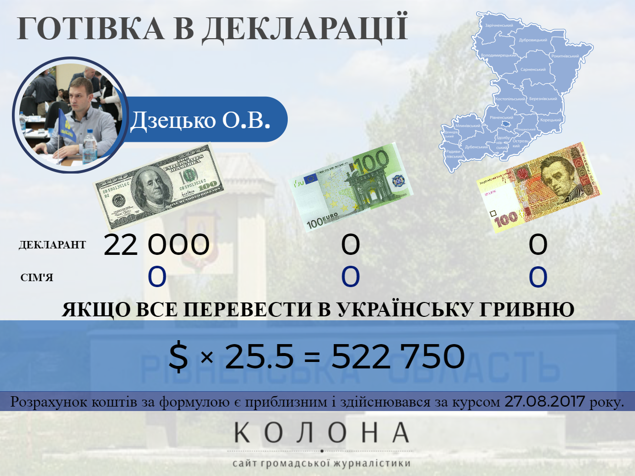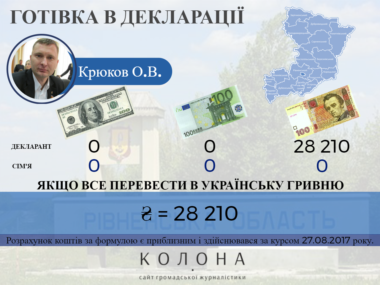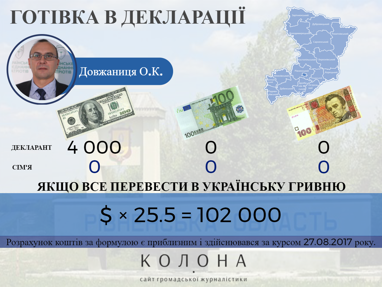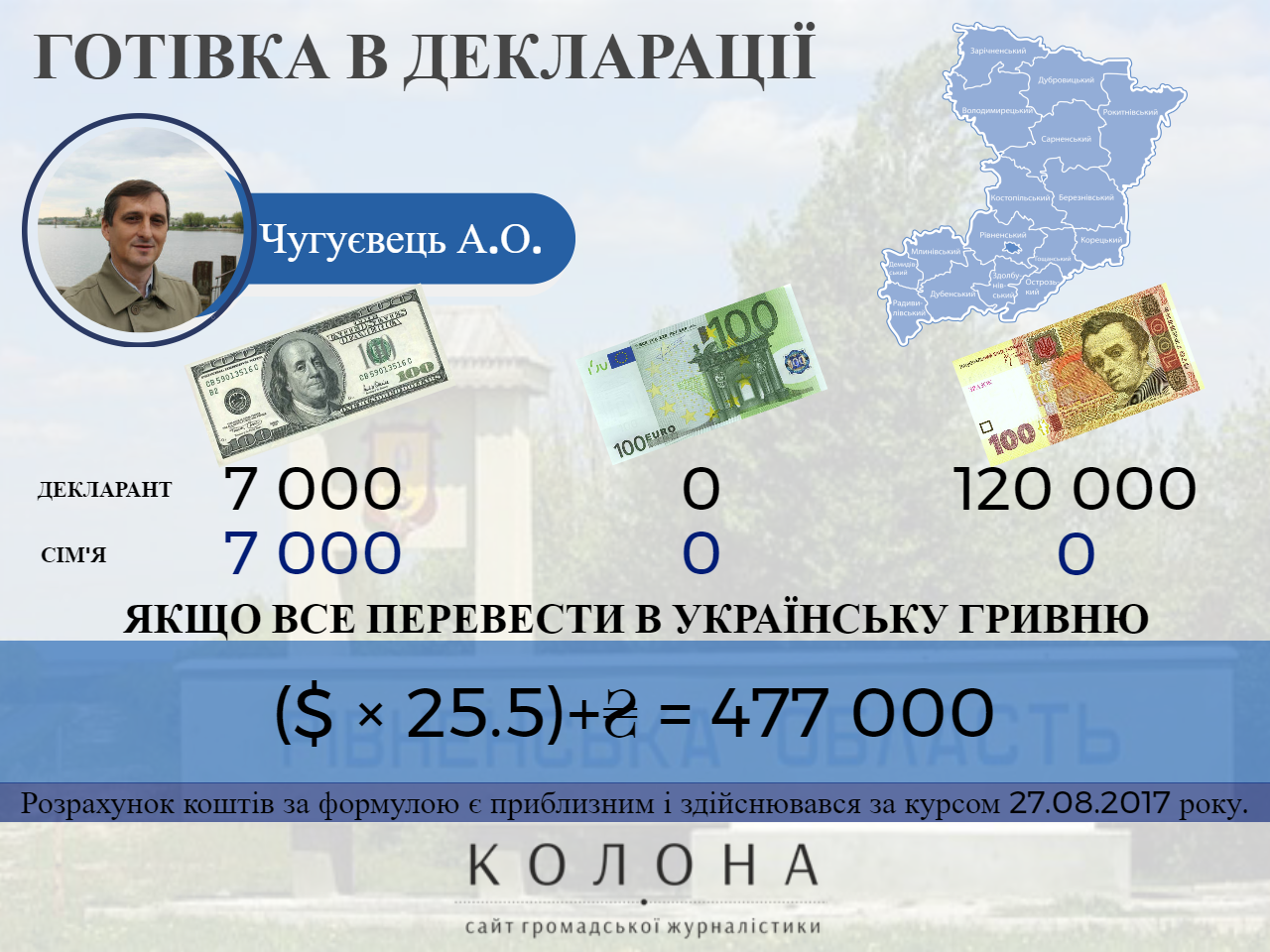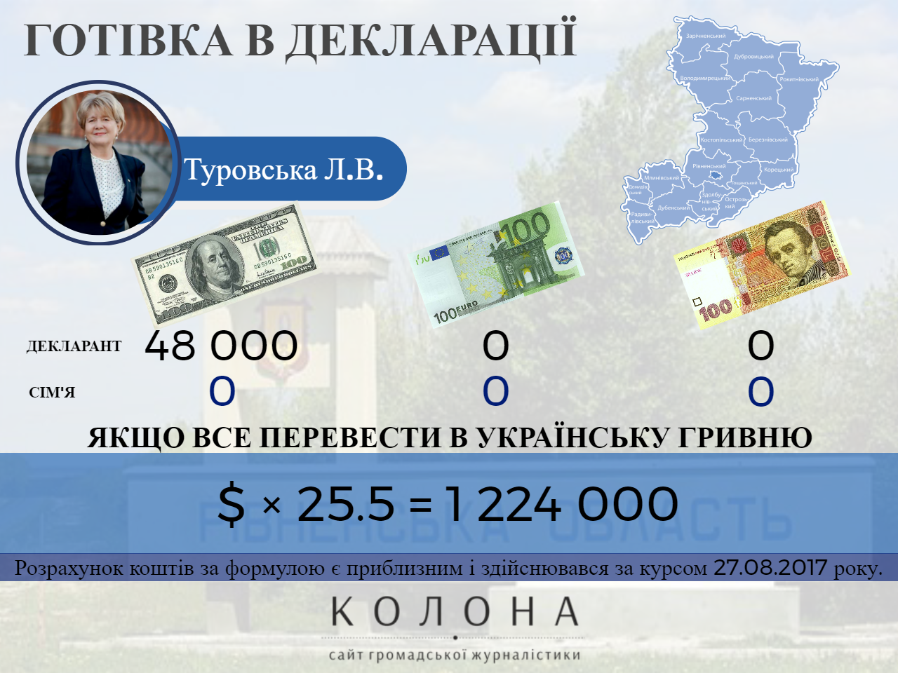 Найблільше готівки серед депутатів Рівнеради зберігає радикал Роман Стасюк. У декларації Ірини Пилипчук не вказано скільки готівки мають члени сімї, також не вказано у якій валюті ці кошти зберігаються. Анатолій Лащук немає власної готівки про те він позичив третім особам 25 тисяч доларів. З 42 депутатів Рівненської міської ради, 9 депутатів взагалі не вказали готівки у своїх деклараціях за 2016 рік. В основному депутати та члени їхніх сімей зберігають готівкові кошти в доларах, з 42 декларацій, у 23 вказано готівку в доларах, в 15 деклараціях зазначено збереження у національній валюті, і у 6 деклараціях вказано готівку у євровалюті. Примітка: до готівкових котів також враховано кошти позичені третім собам та внески до кредиторних спілок та інших небанківських фінансових установ. Набагатшим депутатом Рівненської міської ради є Роман Стасюк, депутат фракції "Радикальна партія Олега Ляшка" . У його декларації за 2016 рік вказано 820 тисяч доларів, 800 тисяч гривень власником яких є сам декларант, дружина депутата Стасюк Орислава є власницею 200 тисяч гривень. Роман Стасюк досі не прозвітувався перед своїми виборцями, хоча згідно розпорядження міської ради це портрібно було зробити ще у лютому 2017. Детальніше про те як звітувалися депутатиміськради читайте у публікації: Чи подають звіти депутати Рівненської міської ради? [Інфографіка] Депутат фракції "Самопоміч" Маріан Года задекларував у готівці 324 тисячі доларів. Людмила Чирак та Маріан Года є одними з найбільших автовласників у Рівненській міській раді. Ще один депутат "Самопомочі" - Чирак Людмила замикає трійку найбагатших депутатів Рівненської міськради. Людмила Чирак є власницею 39 500 доларів, її чоловік Ігор Чирак є власником 65 тисяч доларів, також згідно декларації він позичив третім особам 155 тисяч доларів. Голова Рівненської обласної державної адміністрації, та депутат міськради який перебуває у фракції "Блок Петра Порошенка "Солідарність" Олексій Муляренко задекларував у готівці 115 тисяч гривень, 170 тисяч 500 доларів та 42 тисячі євро. Згідно аналітики громадського руху "Чесно", Муляренко є одним з трьох депутатів, який за результатами відвідуваності сесій та комісій міськради за 2016 рік, може втратити свій мандат. Читайте детальніше про ще двох претендентів Рівненської міськради на позбавлення мандату. Також читайте повну версію про усіх прогульників Рівненської міської ради. Чубай Тетяна від фракції "Громадський контроль" зберігає у готівці 187 500 доларів, цю ж суму але уже у власності членів сім'ї задекларував її чоловік Чубай Олександр від фракції "БПП". Тимощук Тамара від фракції "Блоку Петра Порошенка "Солідарність" у готівці зберігає 500 000 тисяч гривень, 80 тисяч доларів, та 30 тисяч євро. Секретар міської ради та депутат фракції "БПП" Сергій Паладійчук вказав у декларації 68 тисяч 400 доларів, 8500 євро. Також Паладійчук вказав у декларації кошти позичені третім особам 24 600 доларів, та 735 тисяч гривень. також у Сергія Паладійчука є внески до кредиторних спілок та інших небнківських фінансових установ у розмірі 62 тисячі 400 гривень. Перший номер у списку від "Самопомочі" на виборах 2015 року Ігор Ковалець зберігає у готівці 15 тисяч доларів. Про те позичив третім особам 78 тисяч 500 доларів. Перший номер ВО "Свободи" на минулих виборах у Рівному Юрій Осіпчук зберігає у готівці 2 200 000 гривень. Гапяк Б
