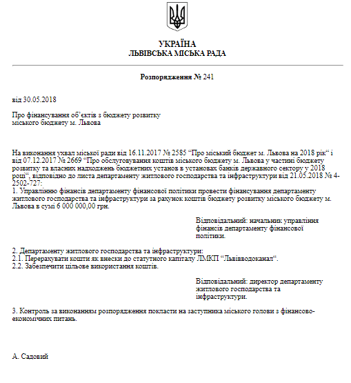 Як зазначено у розпорядженні мера Львова Андрія Садового від 30.05.2018, Львівському водоканалу буде виділено 6 мільйонів гривень з міського бюджету. Усі гроші «освоять» як внески до статутного капіталу КП. Міський голова прийняв рішення виділити з міського бюджету шість мільйонів гривень та направити їх комунальному підприємству «Львівводоканал». Управління фінансів повинно профінансувати департамент житлового господарства. Кошти на фінансування потрібно взяти з бюджету міста, у розмірі 6 мільйонів гривень. Виділені гроші потрібно надіслати до статутного капіталу КП «Львівводоканал». Саме так зазначено у документі, який підписаний міським головою. Контролювати процес фінансування буде заступник мера з фінансово-економічних питань Геннадій Васьків. Як відомо, наприкінці 2017 року, а саме у грудні, міський голова прийняв рішення виділити комунальному підприємству сім з половиною мільйонів гривень. У квітні поточного року Садовий виділив «Львівводоканалу» майже тридцять мільйонів гривень.