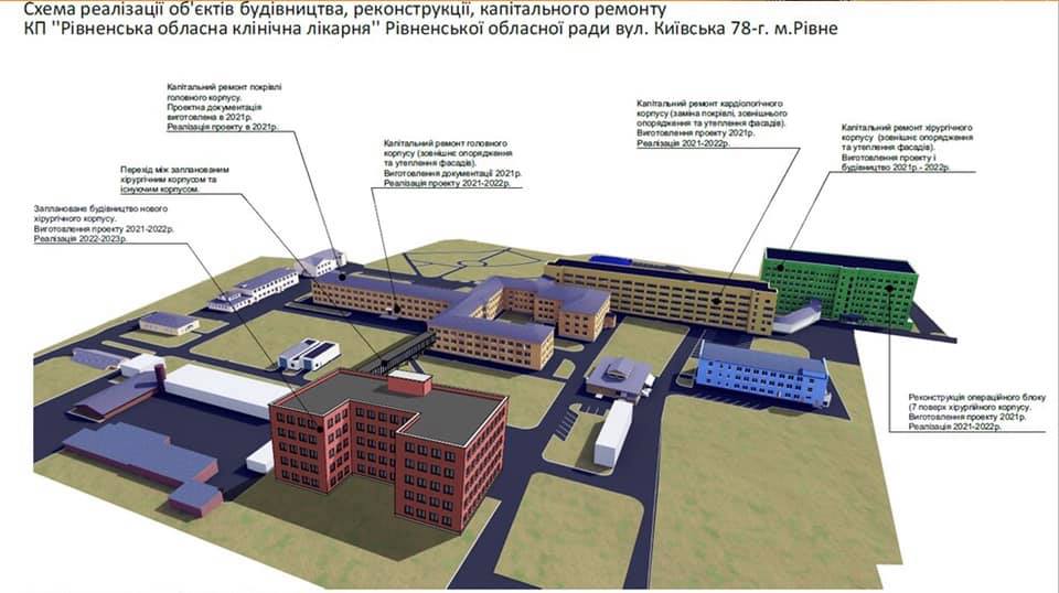 У Рівненській області планують здійснити перепланування двох лікарень. Для перепланування лікарень на Рівненщині виділили з обласного бюджету по 800 тисяч на кожен медичний заклад. Про це повідомляється на сайті Рівненської ОДА. Передбачається здійснити перепланування Рівненської обласної клінічної та дитячої лікарні. Перепланування повинне покращити логістику та надання медичної допомоги. Зокрема повідомляється, що уже здійснені перші напрацювання та є певні ескізи. Їх ви можете побачити на головному зображенні до цієї статті та нижче. Реалізовувати проект планують впродовж найближчих двох років у 2021-2023 р. Планується оновлення 3-х корпусів дитячої лікарні та 10-ти корпусів обласної клінічної лікарні. Зазначається, що для забезпечення потреб медиків проводяться консультації з лікарями у робочих групах де напрацьовують технічні завдання. Лише для проектно-кошторисної документації виділено по 800 ти. грн. на кожен медичний заклад. Кошти на перепланування лікарень на Рівненщині виділено з обласного бюджету.