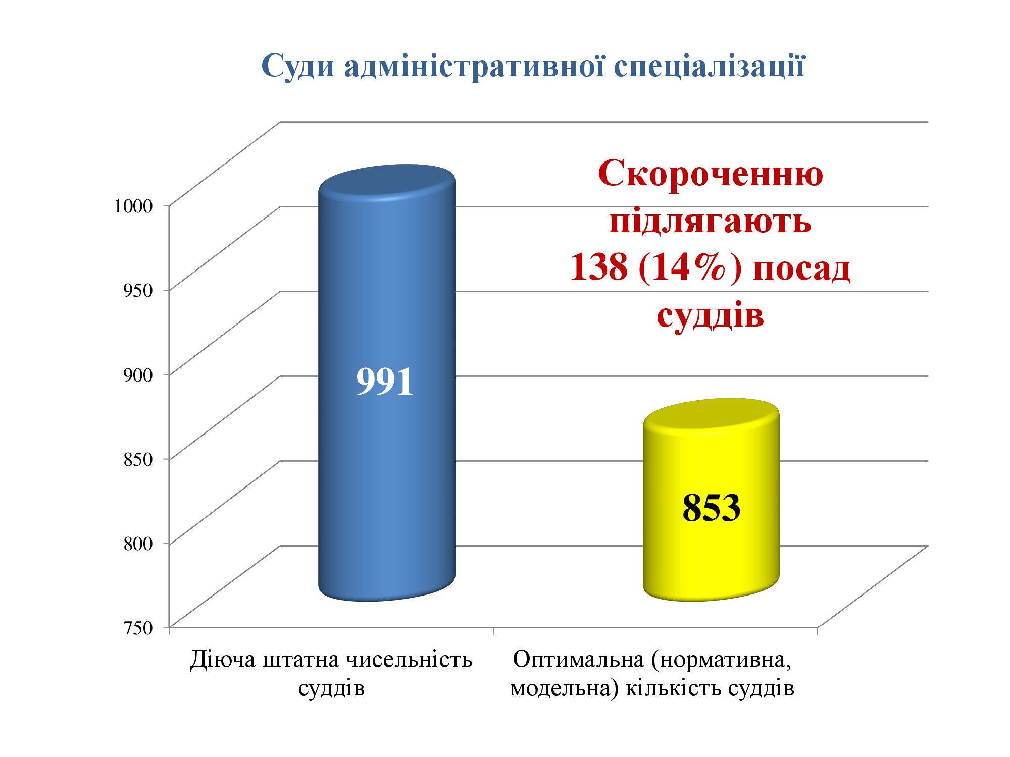 В Україні в спеціалізованих та загальних судах стане менше суддів. За рішення ДСА (Державна судова адміністрації) в Україні скоротять 732 суддів. В Україні було проведено дослідження за підтримки Проекту USAID - "Справедливе правосуддя". Результати дослідження показали коефіцієнт навантаження суддів, часові показники розгляду справ кожного типу. Цей звіт був підтверджений експертами Інституту економіко-правових досліджень Національної академії наук України. Було прийнято рішення Ради суддів України від 16 вересня 2016 року № 61 та затвердженого Головою Державної судової адміністрації України, модельна справа – це судова справа з умовним строком її розгляду протягом 8-годинного робочого дня. На 2017 рік "Модельне навантаження на суддю" становить 183 модельні справи на 1 суддю на рік. Шляхом ділення запланованої кількості вирішених модельних справ на показник "Модельне навантаження на суддю" визначається оптимальна (нормативна, модельна) кількість суддів для кожного суду. В цілому скороченню підлягають 732 посади суддів. Так, відповідно до наказу ДСА України від 8 серпня 2017 року № 841 "Про визначення кількості суддів в адміністративних судах України": -загальна кількість суддів окружних адміністративних судів становитиме 588 суддів (скороченню підлягають 49 посад суддів); -загальна кількість суддів апеляційних адміністративних судів становитиме 265 суддів (скороченню підлягають 89 посад суддів). Наказ ДСА України від 8 серпня 2017 року № 842 визначає кількісний склад суддів господарських судів України, а саме: загальна кількість суддів місцевих господарських судів становитиме 619 суддів (скороченню підлягає 91 посада суддів); загальна кількість суддів апеляційних адміністративних судів становитиме 225 суддів (скороченню підлягають 48 посад суддів). Наказом ДСА України від 8 серпня 2017 року № 843 визначено, що: загальна кількість суддів місцевих загальних судів становитиме 4339 суддів (скороченню підлягають 65 посад суддів); загальна кількість суддів апеляційних судів становитиме 1199 суддів (скороченню підлягають 390 посад суддів). Зазначені накази набувають чинності з першого вересня 2017 року.