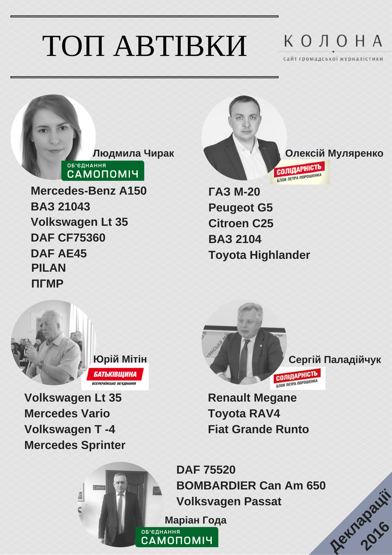 Депутати Рівненської міської ради задекларували 55 транспортних засобів, серед яких легкові та вантажі автомобілі, квадроцикл та приціпи. Найбільше транспортних засобів у Чирак Людмили – 5 автомобілів та 2 причепа, Олексія Муляренка – 5 автомобілів, Юрія Мітіна – 4, Сергія Паладійчука та Маріана Годи по три транспортних засобів у деклараціях. З 42 депутатів Рівненської міської ради 14 не вказали в деклараціях жодних транспортних засобів. В основному депутати декларують легкові та вантажні автомобілі, при декларуванні яких не завжди вказують їхню вартість на момент покупки. Свободівець Юрій Осіпчук їздить на автомобілі по довіреності від свого однопартійця. А чоловіка Пилипчук Ірини не надав інформацію про транспортний засіб яким володіє. Найбільше транспортних засобів серед депутатів Рівненської міськради у декларації за 2016 рік вказано у Чирак Людмили від фракції “Самопоміч”. Вона володіє автомобілем Mercedes-Benz A 150, 2006 року випуску, згідно декларації Людмила Чирак володіє ним з 2014 року, вартість автомобіля на момент набуття права власності склала всього 42 тисячі гривень, хоча такий самий автомобіль зараз на авторинку оцінюється в середньому у двісті тисяч гривень. Усі інші транспортні засоби а це три вантажних автомобілі з яких два марки DAF, один Volkswagen LT 35, легковий автомобіль ВАЗ та два причіпи належать чоловікові депутата Чирак Ігору. У декларації вказано що на момент набуття права власності вартість вантажного автомобіля DAF та Volkswagen склали по 5 тисяч, що насправді є дуже низькою ціною навіть якби сума вказувалася у іноземній валюті такій як долари чи євро. У Олексія Муляренка, який окрім депутатства у міськраді є ще і головою Рівненської ОДА в декларації вказано 5 легкових автомобілів. У власності Муляренка знаходиться чотири автомобілі: ГАЗ М-20, 1953 року випуску, Пежо G5, 1992 р.в., Сітроен С25 1993 р.в., ВАЗ 2104 1988 р.в., п’ятий автомобіль який зазначений у його декларції Тойота Хайлендер 2011 року випуску він орендує у своєї ж фірми “Сталь-М”. У декларації депутата не зазначено за яку суму були придбані автомобілі. [quote style=’2′ cite=”] Нагадаємо, що згідно аналітики ГР “Чесно”, яка стосуєтсья відвідуваності сесій та комісій Рівненської міськради за 2016 рік Олексій Муляренко, Олександ Бабат та Олег Джезько є кандидатами на відкликання Чотири автомобілі задекларував депутат від фракції “Батьківщина” Юрій Мітін, усі транспортні засоби є вантажними. У власності депутата два автомобілі марки Mercedes, а саме Mercedes Sprinter та Mercedes Vario, 2005 та 2003 року випуску, відповідно. Ще два автомобілі задекларовані як “W LT-32” та “W T -4”,оріїнтуючись на модель автомобіля це можуть бути автомобілі марки Volkswagen. По три транспортних засоби записано у деклараціях двох депутатів міськради – Сергія Паладійчука та Маріана Годи. Зокрема Паладійчук володіє Renault Megane 2007 року випуску, який на момент придбання згідно декларації вартував 111 тисяч 717 гривень, та користується автомобілем Toyota RAV4 2016 року випуску, власником якої є третя особа ПП “РКА “Бюро Март”. У дружини депутата Оксани Паладійчук Fiat Grande Runto 2011 р.в., власником якого є та саме юридична компанія ПП “РКА “Бюро Март”. Маріан Года є власником вантажного автомобіля DAF, 2000 року випуску, та квадроциклу який придбав у минулому році. У декларації Маріана Годи також вказано автомобіль його дочки Мар’яни, вона є власнецею Volksv