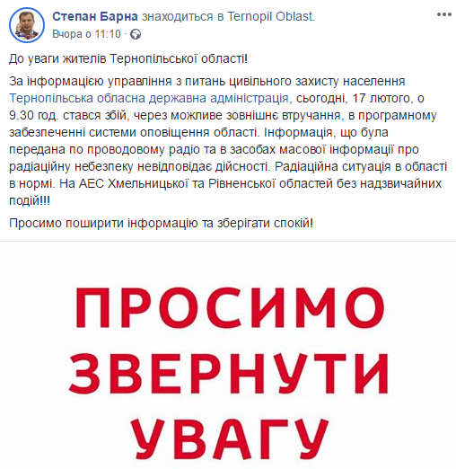 17 лютого на Тернопільщині було сповіщено про радіаційну небезпеку. За словами Степана Барни це відбулося через збій програмного забезпечення системи оповіщення. Голова ОДА запевнив, що радіаційна ситуація в Тернопільській області в нормі. Нагадуємо, що вчора о 9:30 спочатку на під час ефіру "Ua: Українське радіо Тернопіль" з'явилася інформація про радіаційну небезпеку на території Тернопільської області. Надалі ця інформація розповсюдилася в інших ЗМІ. Уже через певний час ця інформація була спростована головою Тернопільської ОДА, ДСНС України в Тернопільській області, а також на сайті UA: Суспільного. Через, що виник збій у програмному забезпеченні внаслідок чого з'явилася недостовірна інформація наразі не відомо. Розглядається можливість зовнішнього втручання у роботу програмного забезпечення та апаратури.