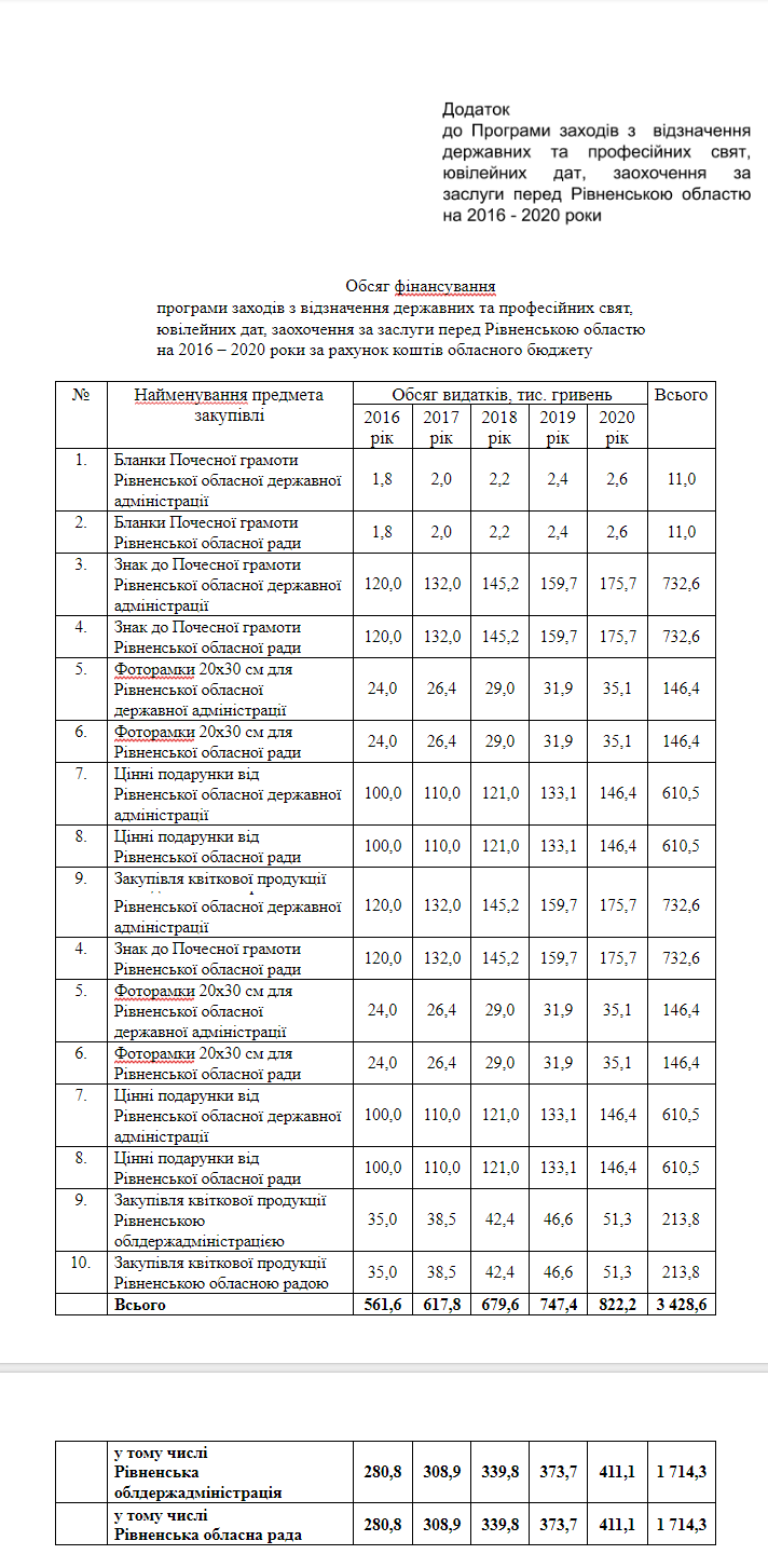 Рівненська обласна рада купила 92 персональні хронометри (наручні годинники) з символікою та гравіюванням у футлярах за 110 тисяч гривень. Вартість одного годинника склала близько 1195 гривень. [caption id="attachment_65858" align="aligncenter" width="699"] Скрін із сайту виконавця тендеру - https://watch.kiev.ua/store/sl[/caption] Про це стало відомо зі звіту, розміщеного на Прозорро. Так як сума менше 200 000 гривень, так звана допорогова, тобто тендер проводити не обов’язково, то угоду напряму уклали з ТзОВ «Київський годинниковий завод». Для порівняння, подібну закупівлю нещодавно провело і Головне управління Національної гвардії України (Київ), вони купили по ціні 1 315 гривень за штуку. А Донецька обласна державна адміністрація купила по 684 гривень, але від іншого виробника ТзОВ "Перший український годинниковий завод "Київська Русь". Як прокоментували закупівлю Рівненської облради в громадській ініціативі «За чесний тендер», очікувана вартість нижче 200 тисяч гивень, тому замовник (апарат облради) міг як проводити тендер, так і на пряму вибрати постачальника, тобто порушень закону тут немає, а питання ефективності витрачання бюджетних коштів залишають на розсуд платників податків. Громадський активіст Юрій Дюг, не бачить "зради" у закупівлі наручних годинників: Не бачу особливої «зради» в цій закупівлі. Обласна рада постійно купляє такі годинники вже багато років уже. І не раз піднімалось питання навіщо це і чи не задорого. Наскільки я знаю то годинниками нагороджують кращих працівників різних галузей до професійних свят і таке інше. Так само як і грамотами і нагрудними знаками. Питання тільки чи обґрунтована ціна, бо з документації не можна встановити модель годинника та порівняти з ціною аналогів в інтернеті, коментує Директор Громадської організації "Антикорупційний моніторинг" Юрій Дюг. [caption id="attachment_65867" align="alignnone" width="818"] Юрій Дюг[/caption] Нашій редакції вдалось отримати документи на основі яких обласна рада замовила ці годинники та іншу сувенірну продукцію. У відповіді облради вказується, що дана закупка годинників відбулась в рамках "Програми заходів з відзначення державних та професійних свят, ювілейних дат, заохочення за заслуги перед Рівненською областю на 2016 - 2020 роки". Проаналізувавши програму, в додатку №1 до неї вказано обсяги фінансування на придбання наручних годинників на кожен рік відповідно до програми. Варто зазначити, що із кожним роком на цінні подарунки обласна рада буде витрачати більше на 10 тисяч гривень. Також, в процесі стало відомо що таку ж кількість коштів на цінні подарунки витрачає і обласна адміністрації, якою наразі керує Олексій Муляренко. Якщо додати всі витрати на цінні подарунки в рамках Програми 2016 - 2020, то отримуємо суму 610 тисяч 500 гривень. Таку ж суму на цінні подарунки в рамках програми витрачає і адміністрація Рівненської області. Додавши витрати обласної ради та обласної державної адміністрації, отримуємо витрачених наших податків 1 мільйон 223 тисячі гривень. Бачимо що крім витрат на цінні подарунки є інші витрати передбаченні програмою. Такі позиції як "знак до почесної" грамоти та замовлення квіткової продукції лідирують, на першу і другу позицію влада області за п'ять років витрачає по більше ніж 700 тисяч гривень. Хто приймав програму, можна переглянути на сайті обласної ради. Висновки робіть самі!