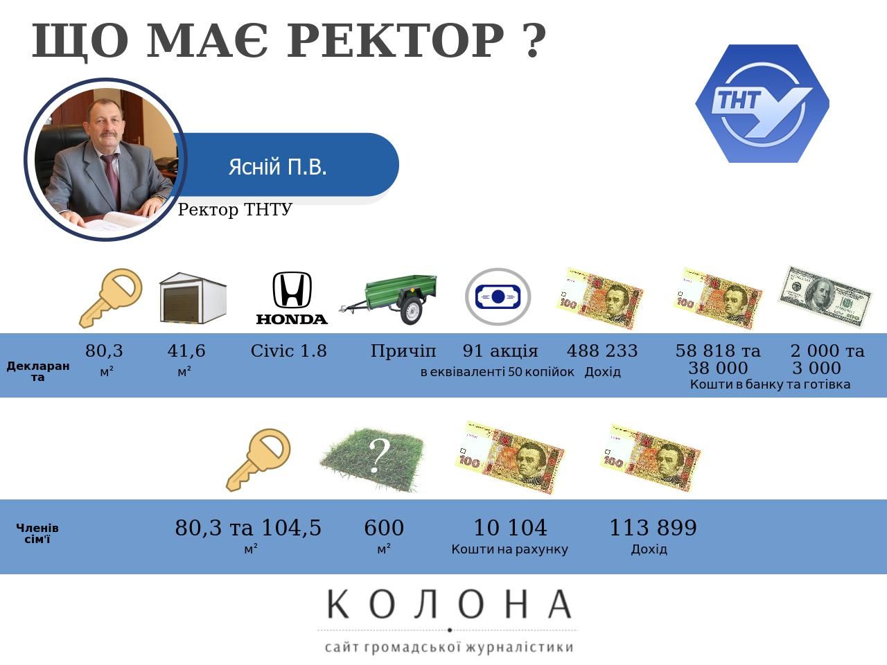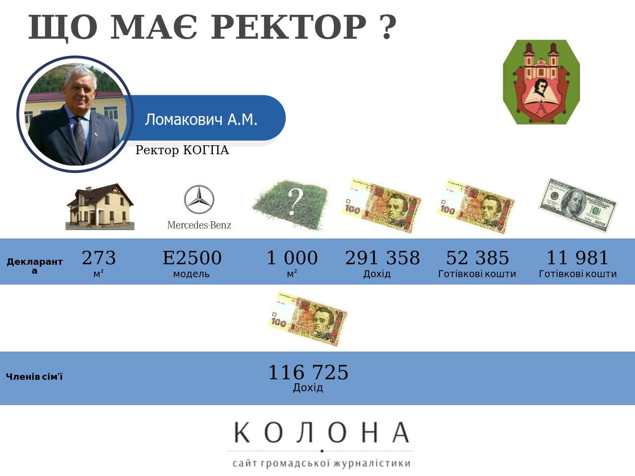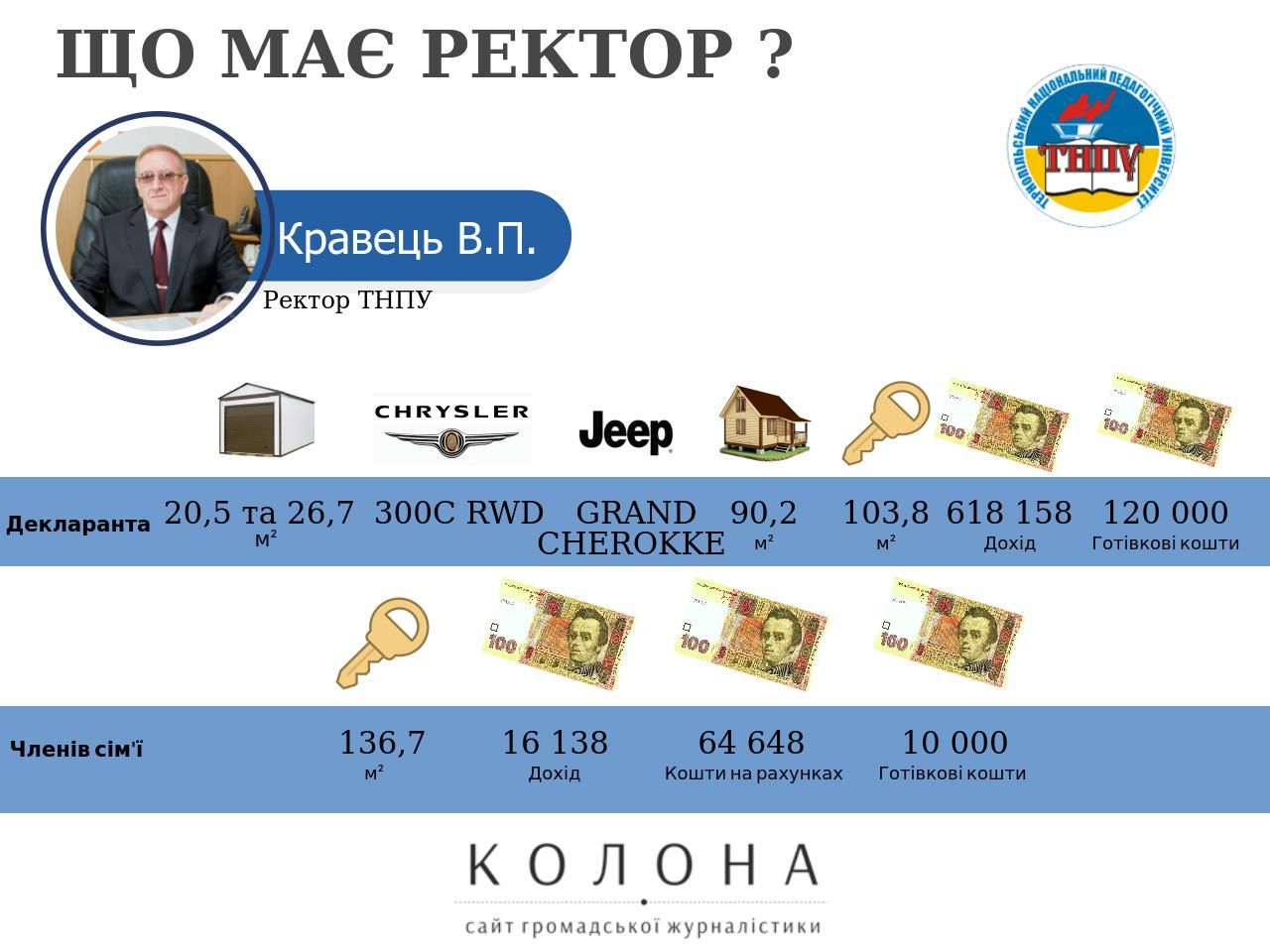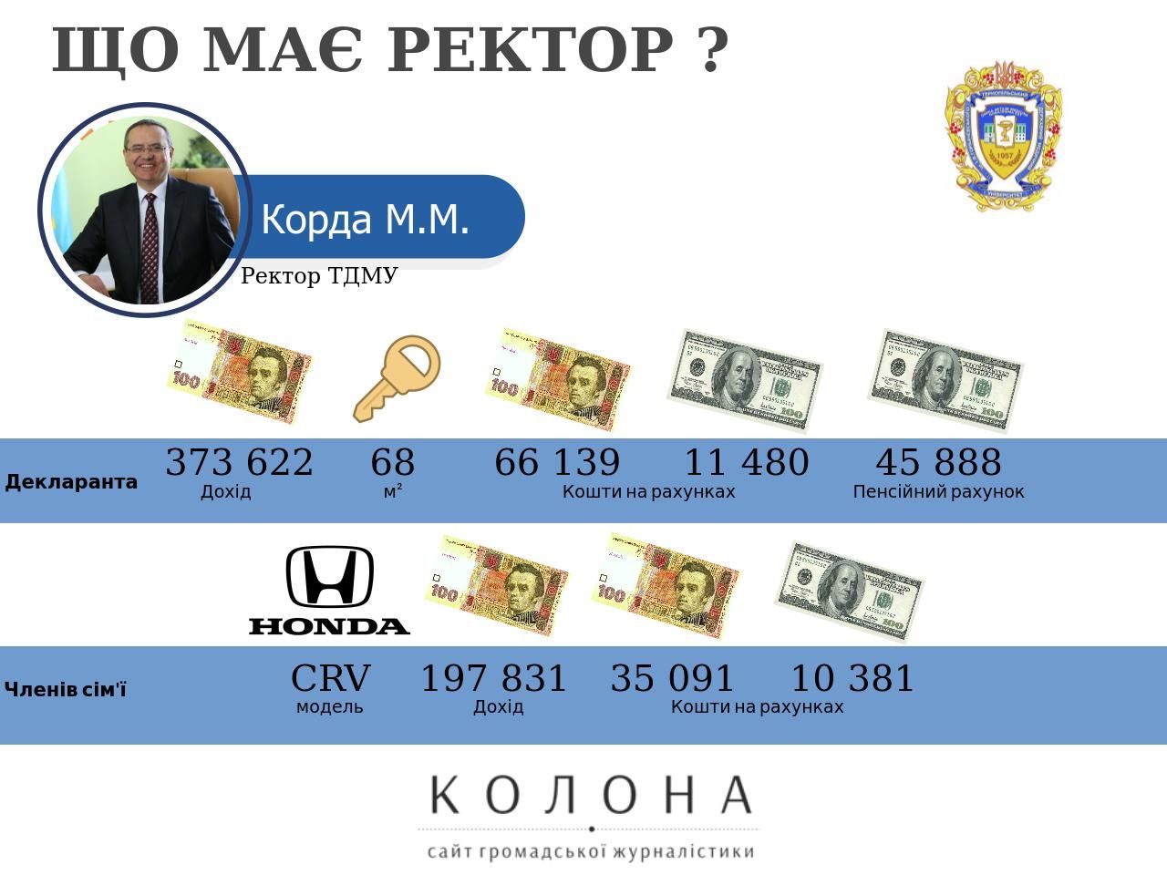 Ректор Кременецької академії та ректор ТНЕУ мають будинки в одному селі. Ректор який має чотири будинки, а його сім'я ще три квартири. Ректор який отримав третину квартири за 10 гривень. Елітні автомобілі, мільйонні доходи та готівкові кошти ректорів державних університетів Тернопільщини. Про це читайте детальніше у матеріалі Сайту громадської журналістики. Якщо громадяни знають про зловживання своїм становищем та не доброчесне заповнення е-декларації ректорами університетів Тернопільщини, просимо повідомляти нашу редакцію про такі факти на електронну скриньку – kolona.ukraine@gmail.com. Тернопільський державний медичний університет ім. І.Я.Горбачевського, ректор - Корда Михайло Михайлович Михайло Корда очолює Тернопільський державний медичний університет з січня 2015 року. У своїй електронній декларації за 2016 рік, Михайло Корда серед членів сім'ї зазначив дружину - Інна Корда, та сина - Михайло Корда. Серед нерухомості ректора медичного університету зазначено лише квартиру площею 68 метрів квадратних у Тернополі, яка знаходиться у власності з 1 січня 2004 року. У ректора Тернопільського медуніверситету згідно декларації немає власного автомобіля, єдиним власником транспортного засобу є його дружина Інна Корда, на яку зареєстрований автомобіль Honda CRV, який був придбаний у 2011 році за 277 тисяч 870 гривень. Ректор Корда в минулому році отримав три види доходів, серед яких зарплата за основним місцем роботи (Тернопільський державний медичний університет ім. І.Я.Горбачевського) - 307 тисяч 110 гривень, гонорари та інші виплати з цивільно-правовим правочином (Тернопільський державний медичний університет ім. І.Я.Горбачевського) - 42 тисячі 815 грн, а також проценти (ПАТ КБ "ПРИВАТБАНК") - 23 697 грн. Дружина ректора Інна Корда, також працює в медичному університеті минулому році отримала зарплату у розмірі 163 тисячі 351 грн, окрім цього її доходи у 2016 році становили проценти (ПАТ КБ "ПРИВАТБАНК") - 25 257 грн, та страхові виплати (ПРАТ УПСК Тернопільська філія) - 9 223 грн.. Михайло Корда на своєму рахунку в банку (ПАТ КБ "ПРИВАТБАНК") зберігає 66 тисяч 139 гривень, та 11 тисяч 480 доларів. Також ректор медуніверситету є власником пенсійного рахунку який знаходиться закордоном в State Teachers Retirement Systems of Ohio (найменування українською - Державна пенсійна система викладачів Огайо) - 45 тисяч 888 доларів. Інна Корда зберігає у банку (ПАТ КБ "ПРИВАТБАНК") 35 091 грн, та 10 тисяч 381 доларів. Корда Михайло є членом таких організацій як Первинна профспілкова організація ТДМУ, та громадська організація "Асоціація випускників ТДМУ", в останній він є членом керівного органу. Тернопільський національний економічний університет, ректор - Крисоватий Андрій Ігорович Андрій Крисоватий очолює ТНЕУ з квітня 2013 року. Декларація Крисоватого містить відомості про двох членів сім'ї дружину - Крисовата Оксана та доньку Крисовата Лілія. Крисоватий Андрій є власником земельної ділянки 1 200 кв.м., у селі Петриків Тернопільського району, яка була придбана у 2002 році за 8 438 грн., та житлового будинку у цьому ж селі, площа будинку становить 326,50 метрів квадратних, була придбана разом з земельною ділянкою, про те будинок Крисоватому обійшовся в 115 тисяч 853 грн. У власності Крисоватого є 50% власності земельної ділянки площею 250 м.кв. (вартість на момент набуття права власності - 36 875 грн.), та двох житлових будинків площами 150,2 к