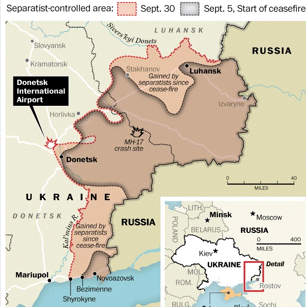 Проросійські бойовики нападають на Донецький аеропорт, який утримують українські сили - й бої в Україні, попри оголошений режим припинення вогню, насправді посилюються. Про це пише Washington Post . Більш того, за інфографікою, складеною газетою - бойовики просуваються вперед: